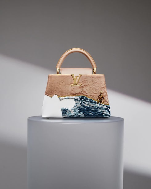 IEn una fusión de arte y moda, el patchwork de seda de bronce original de Zangewa se escaneó e imprimió en alta definición sobre piel suave, capturando sus pliegues naturales, y se unió a los Capucine con costuras deliberadamente irregulares. Un tema recurrente de su pieza, los detalles dorados perfilan el borde de la piscina y continúan a lo largo de la parte superior del bolso, hasta la firma metálica de LV. "Me encanta las sensaciones táctiles, así que trabajar con tela era casi inevitable". - Billie Zangewa