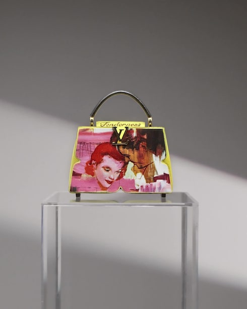 Como muestra de un savoir-faire único, miles de puntadas de bordado reproducen pinceladas del cuadro Tenderness de 2021 de los artistas, que luego se imprimen meticulosamente en el panel frontal del bolso en tonos vibrantes, para acentuar su profundidad. Este proceso se repite en el panel trasero para transponer una paleta caleidoscópica, en una representación conceptual del perpetuo volver a empezar. "Esa obra pertenece a una serie de pinturas 'sentimentales', que se inspiran en la fuente iconográfica de las imágenes publicitarias de los años 50". - Ida Tursic y Wilfried Mille