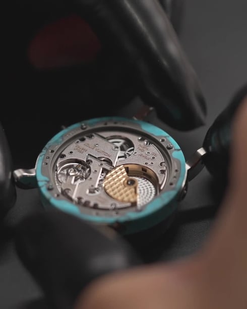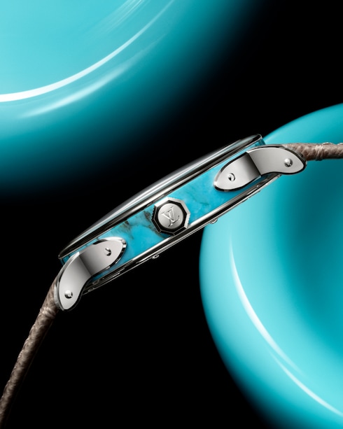 El Louis Vuitton Escale Turquesa combina una esfera y una caja central en piedra azul intenso, cada una tallada a partir de un único bloque con vetas y profundos patrones orgánicos que hacen que cada pieza sea única. El reloj de 40 mm refleja la maestría técnica de La Fabrique des Boîtiers, el taller de Louis Vuitton en Ginebra dedicado al arte de la fabricación avanzada de cajas.