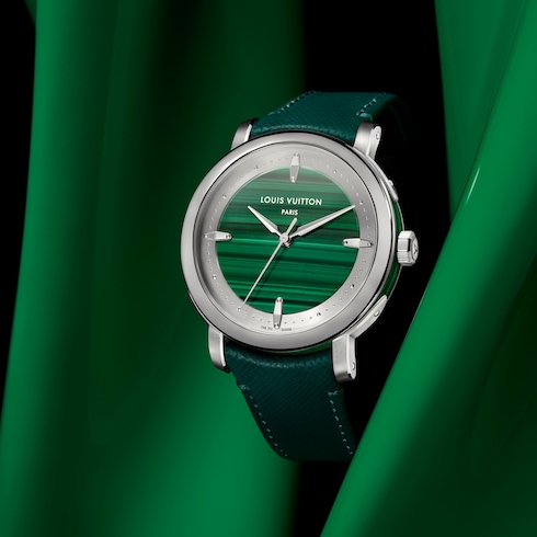 El Louis Vuitton Escale Malaquita se caracteriza por sus finas vetas minerales, que reflejan tonos verdes intensos y capas multicolores. Cada reloj de 40 mm está elaborado con el máximo cuidado, desde la selección precisa de la piedra ornamental hasta el delicado pulido que revela su brillo.