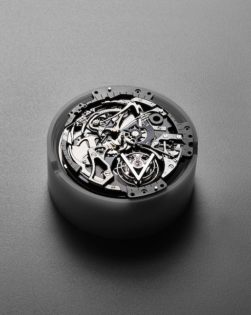 Uniendo dos mundos de diseño moderno y artesanía perfeccionada por el tiempo, este reloj excepcional sitúa dos iconos de la alta relojería en el centro de la escena: un escape Tourbillon Volante y un sorprendente mecanismo conocido como Cathedral Minute Repeater.