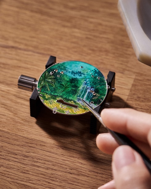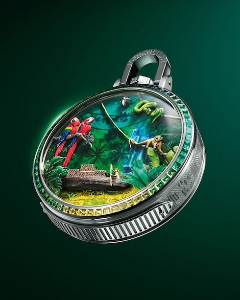 Combinando una audacia creativa sin precedentes con la experiencia relojera de los artesanos de La Fabrique du Temps Louis Vuitton, la Maison se adentra en el corazón de la selva amazónica, ilustrando uno de los relojes más complejos de Louis Vuitton. Sublimada por siete animaciones diferentes, la esfera presenta un paisaje extremadamente detallado, mientras que el fondo del reloj revela una segunda perspectiva transparente: el calibre LFT AU14.03 con autómata y repetición de minutos, con su excepcional artesanía.