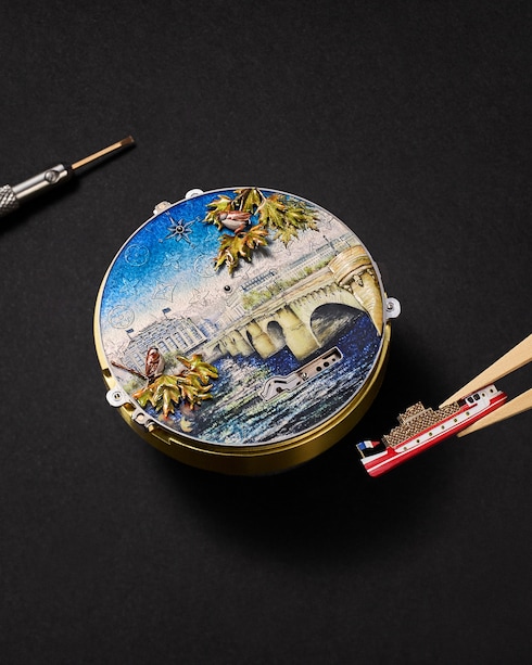Oda a la herencia del savoir-faire de los baúles y a su espíritu innovador, el reloj de bolsillo Escale au Pont-Neuf celebra la tradición de Louis Vuitton, situada a orillas del Sena, con vistas al puente más antiguo de París. El pintoresco paisaje de la esfera se presenta a través de siete animaciones, impulsado por el movimiento mecánico más complejo de la Manufactura hasta la fecha, el calibre LFT AU14.03 de cuerda manual, que demuestra su meticuloso trabajo artesanal a través del fondo de la caja.