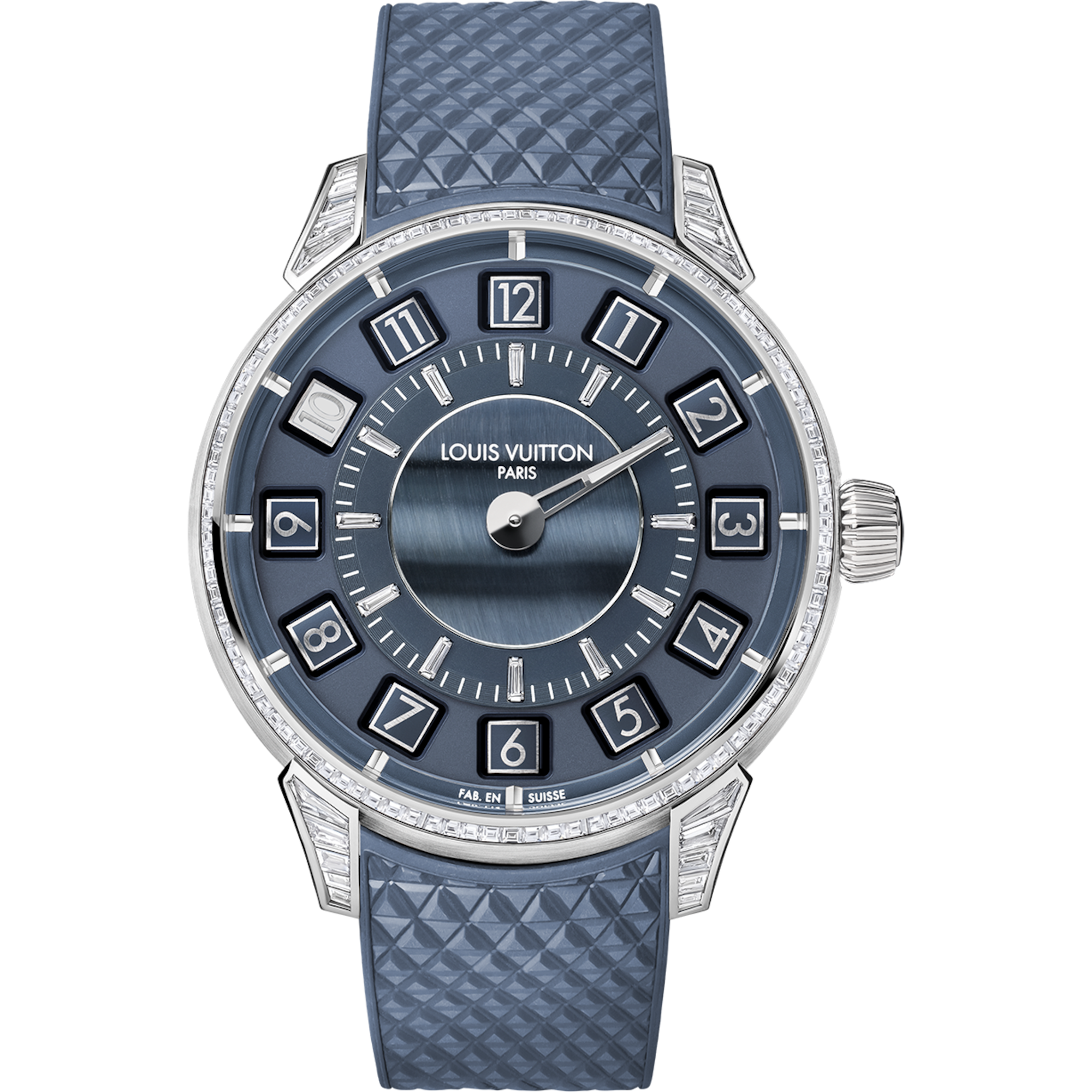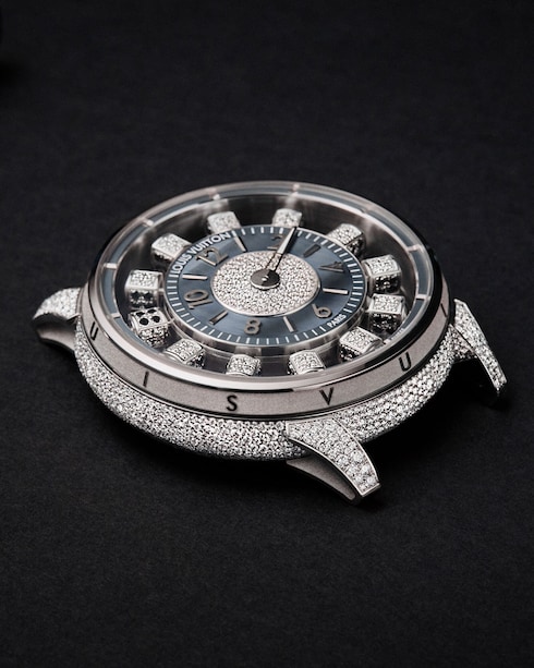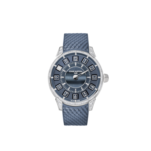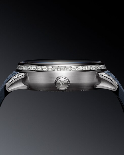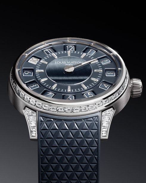 Alojado en una caja de 39,5 mm de oro blanco de 18 quilates, el Tambour Taiko Spin Time tiene una hermeticidad de hasta 100 metros y una correa de caucho integrada. Impregnado de elegancia contemporánea, este modelo está disponible en versiones con y sin pavé. La edición con pavé está adornada con 94 diamantes talla baguette engastados a mano en las asas y la esfera de ojo de halcón, que desprenden un brillo, una profundidad y una textura excepcionales.