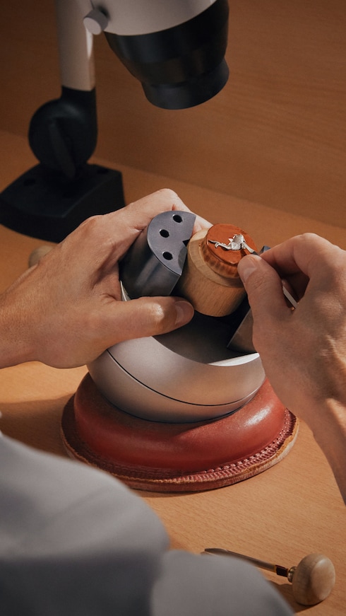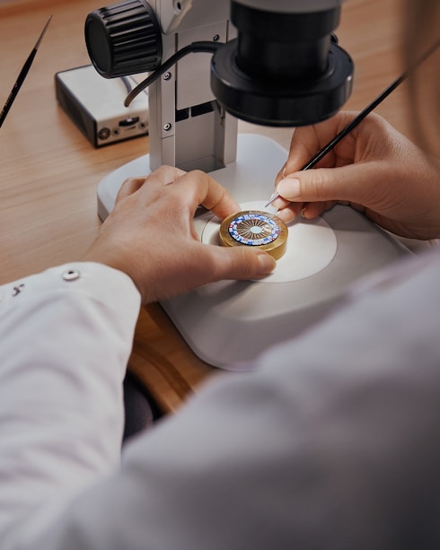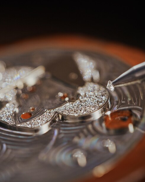 Embelleciendo biseles, cajas y esferas con un brillo radiante, el engaste de gemas añade un toque de preciosidad a las creaciones de la fábrica. En primer lugar, el metal es finamente trabajado por el maestro joyero para albergar las piedras, que a continuación son engastadas con un cuidado y un arte inmaculados por el maestro engastador, utilizando métodos refinados como el engaste cerrado, en garra y en nieve para evocar un acabado poético.