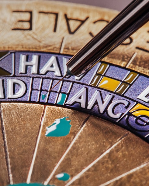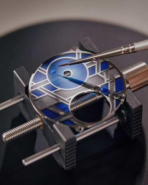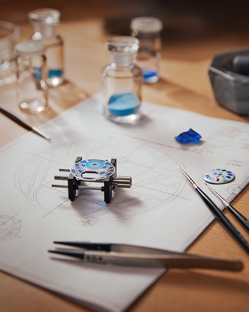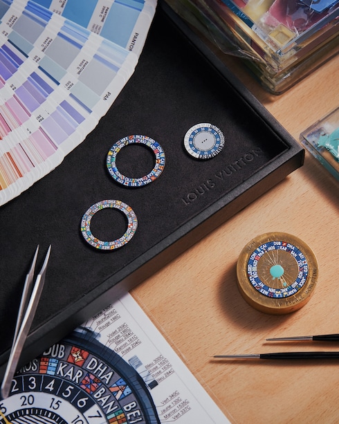 El esmaltado es un arte exigente que requiere habilidades muy técnicas adquiridas a lo largo de varios años por los maestros esmaltadores de La Fabrique du Temps Louis Vuitton. Entre ellos se encuentran el plique-à-jour, con su juego de transparencias y contrastes, resaltado por una estructura cloisonné dorada, y el paillonné, que magnifica las capas de esmalte con finas motas de pan de oro.