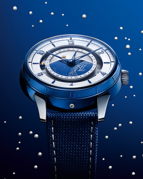 El LVDB-03 GMT Louis Varius reafirma los atrevidos códigos del Tambour, caracterizado por sus icónicos números e índices. En su centro, el característico Starry Sky de De Bethune se impregna del espíritu de Louis Vuitton, plasmado a través de alfileres de oro blanco aplicados a mano y lámina de oro que trazan la constelación de la Maison.