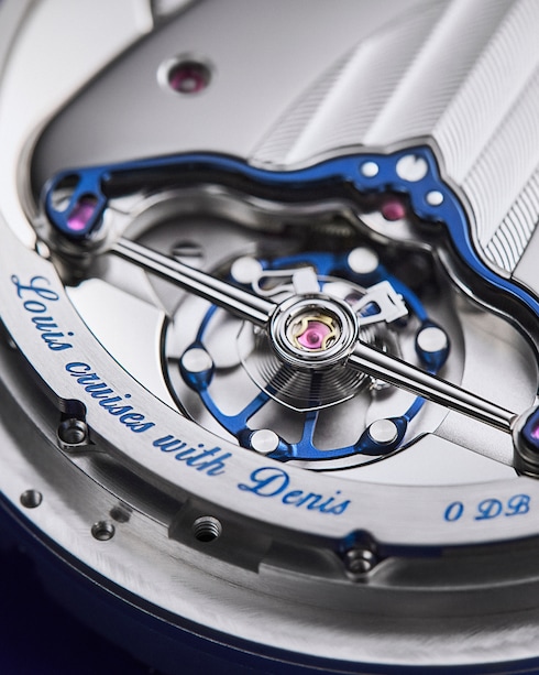 Creada a partir de la combinación entre dos emblemáticas Maisons, la emblemática caja Louis Vuitton Tambour Taiko presenta por primera vez un acabado en el característico azul de De Bethune. El fondo abierto de la caja revela un calibre extraordinario que exalta el más alto nivel de savoir-faire relojero, firmado «Louis Cruises with Denis».
