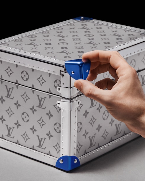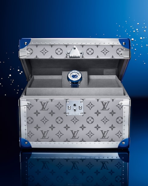 Un baúl de titanio único presenta el LVDB-03 GMT Louis Varius en su versión más refinada, conmemorando esta colaboración relojera. Fabricado y ensamblado en el histórico taller de fabricación de baúles de Louis Vuitton en Asnières, destaca por sus esquinas de titanio azulado pulidas a mano que recuerdan a la caja del Tambour Taiko, estableciendo un diálogo entre el tiempo y los viajes.