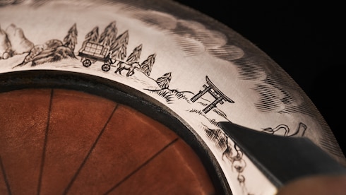 Fabricada y acabada en La Fabrique des Boîtiers, la caja del Tambour Taiko combina una silueta escultural y una construcción azulada lograda mediante el proceso de oxidación térmica patentado por De Bethune. Un bisel grabado con las doce letras de Louis Vuitton, asas de platino y una corona detallada realzan la extraordinaria muestra de virtuosismo artesanal.