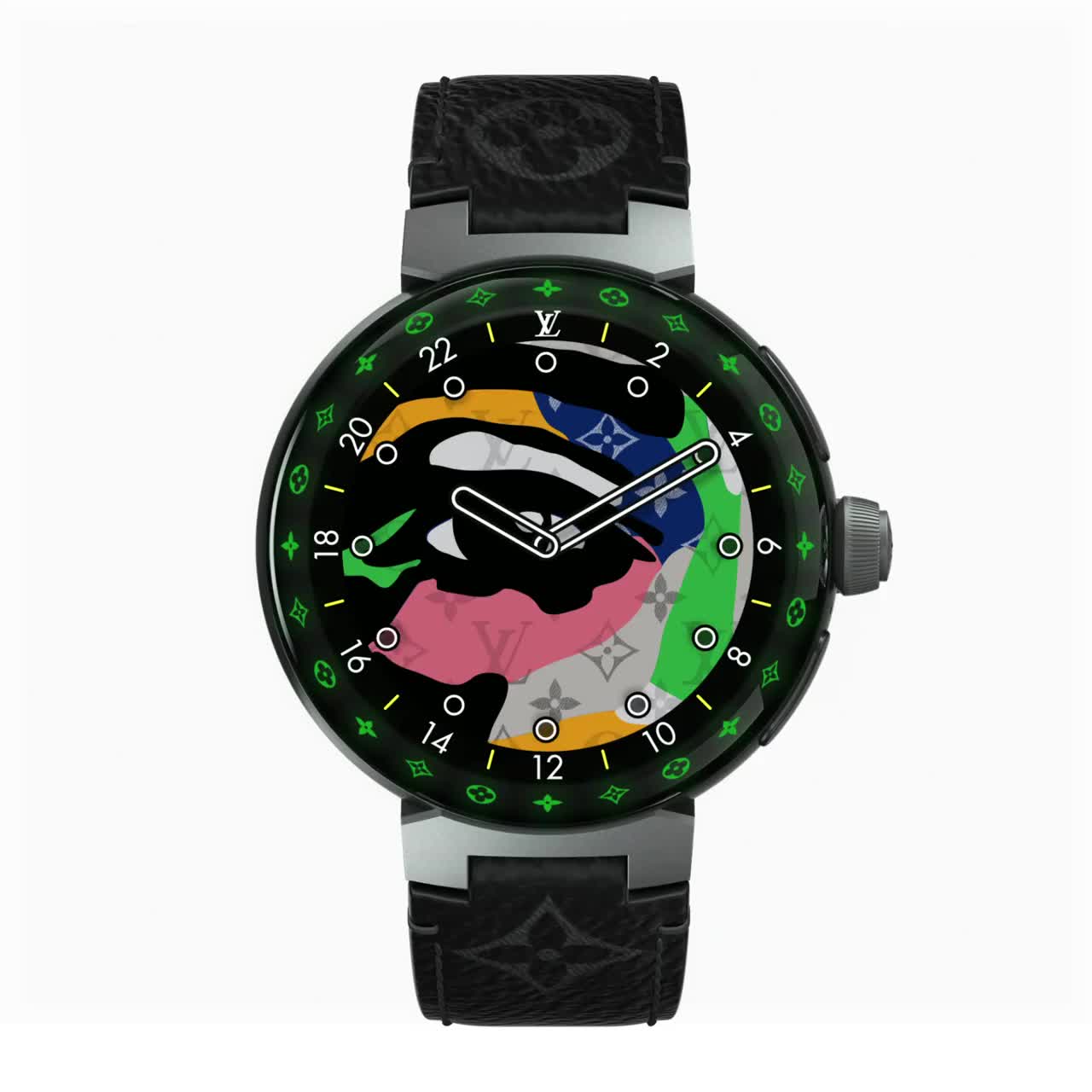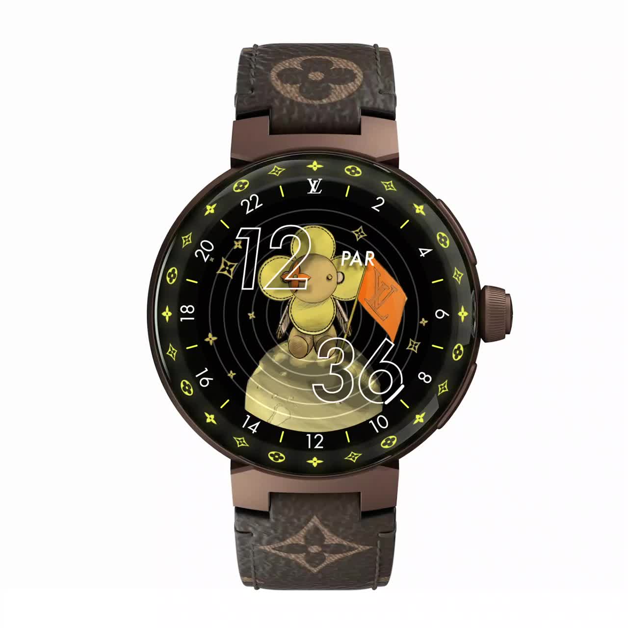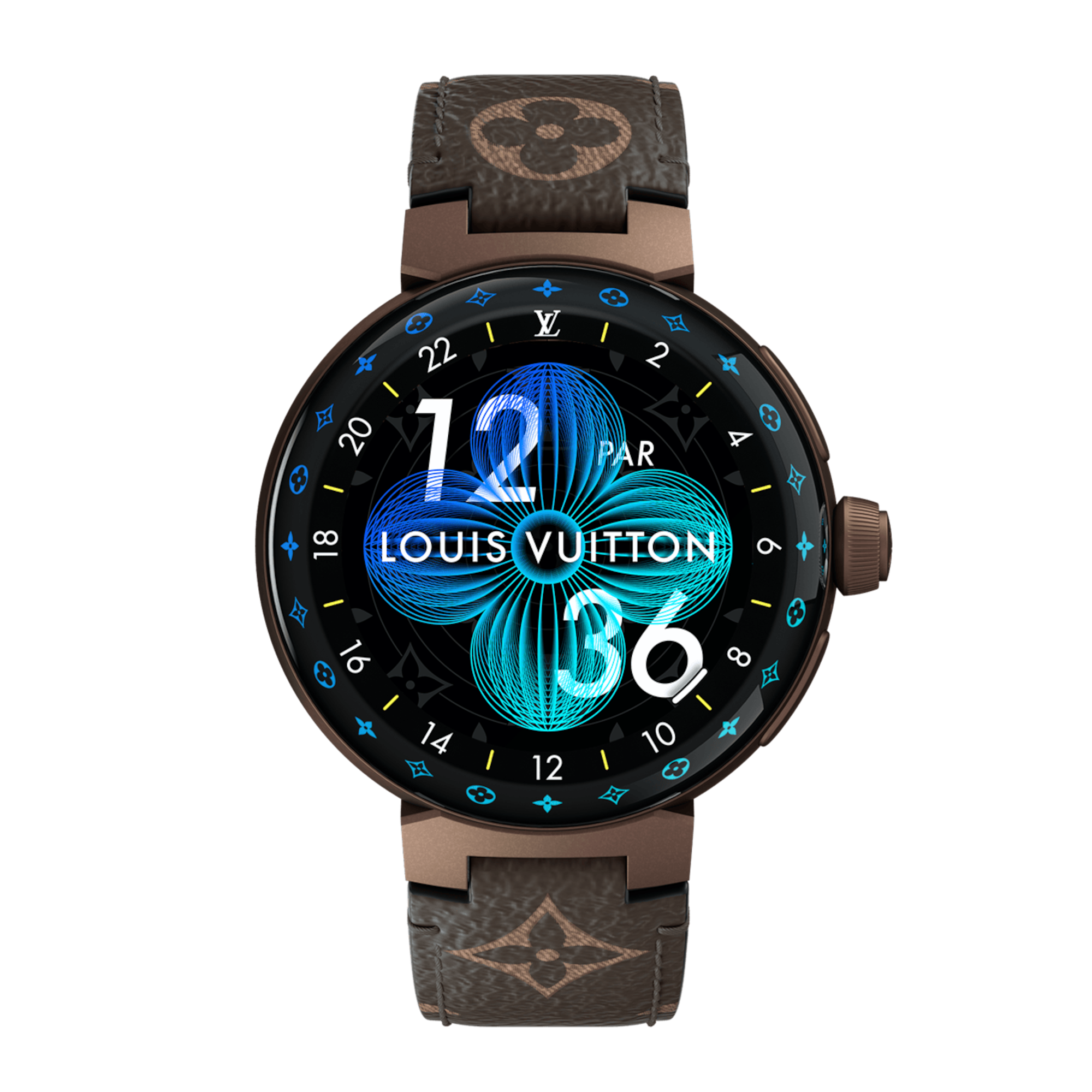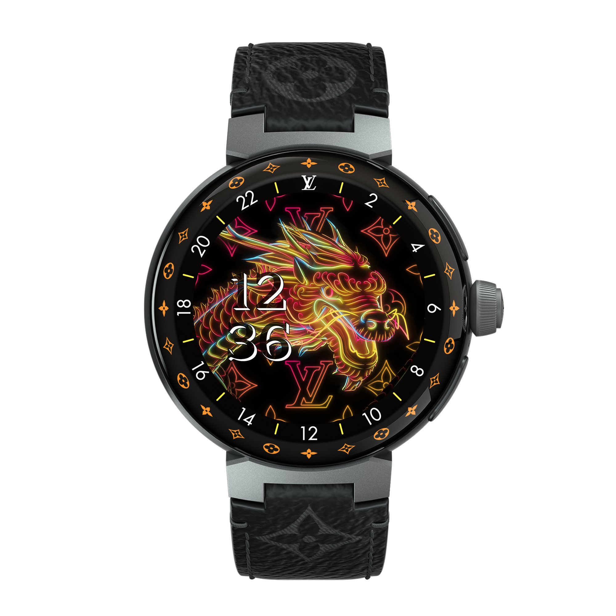 Sobre el borde, 24 luces LED iluminan el emblemático anillo Louis Vuitton Monogram, como un caleidoscopio de colores que crea una fascinante animación en la oscuridad cada vez que se enciende el reloj.