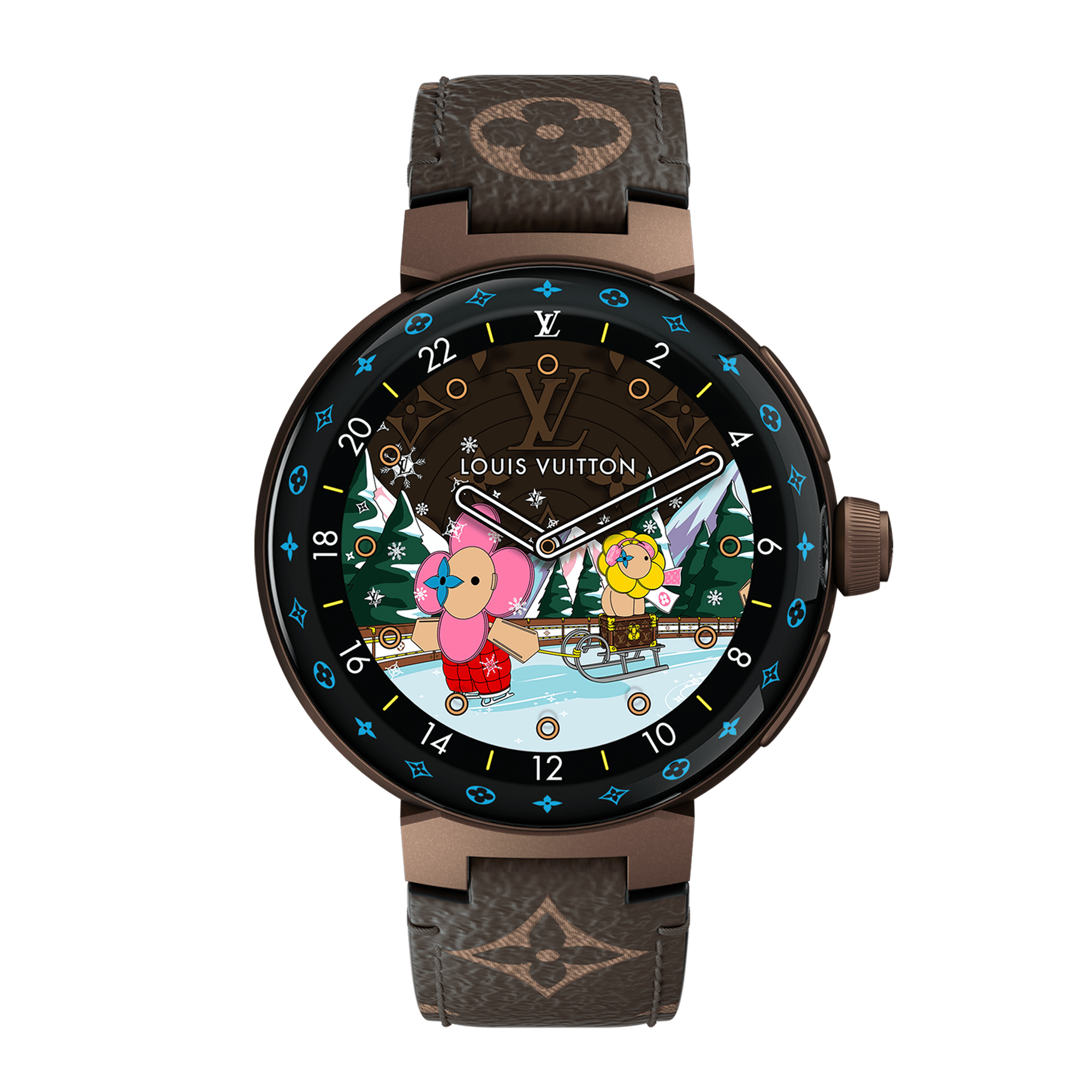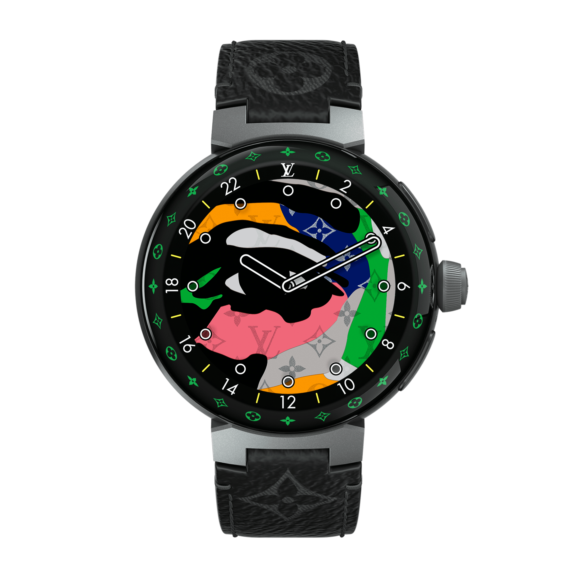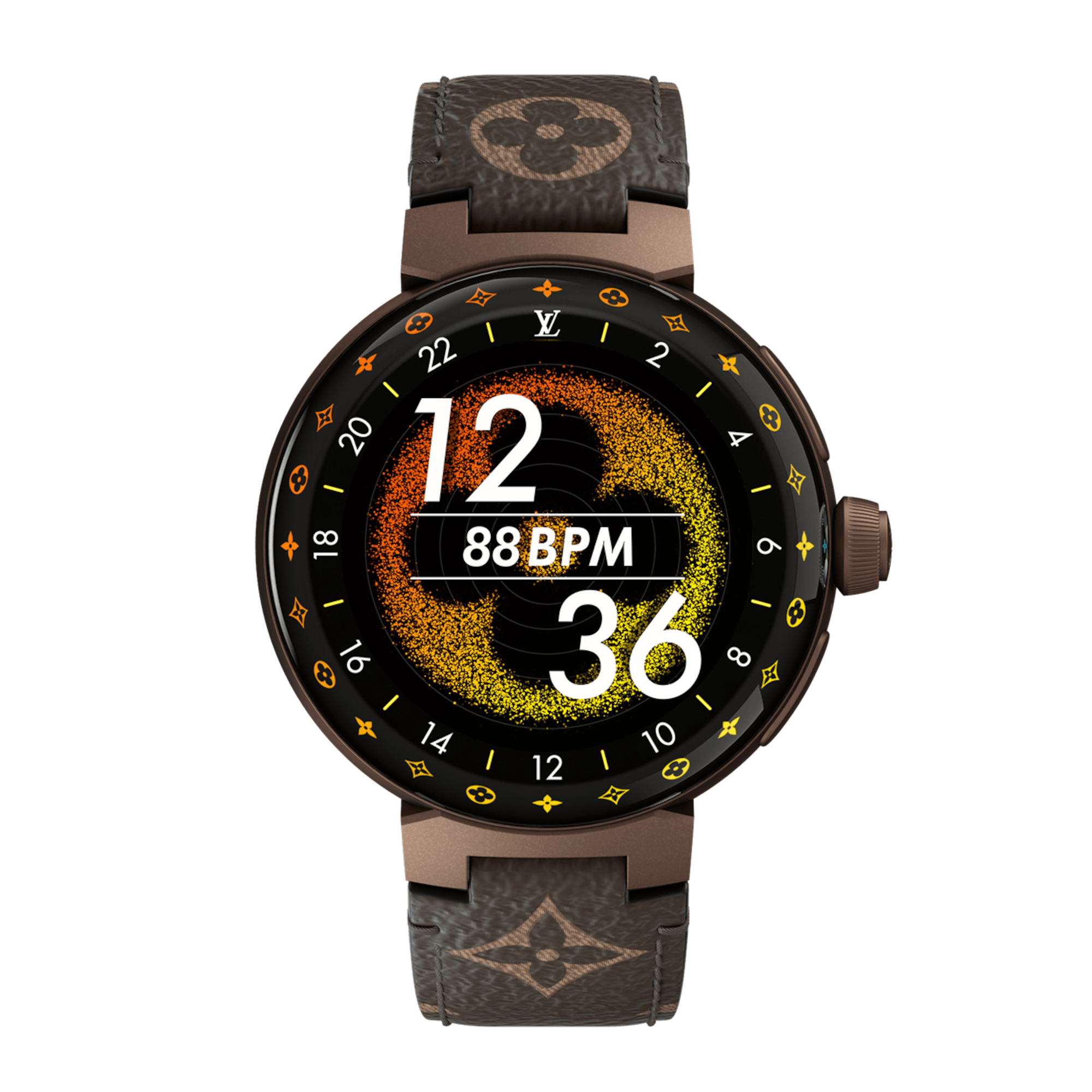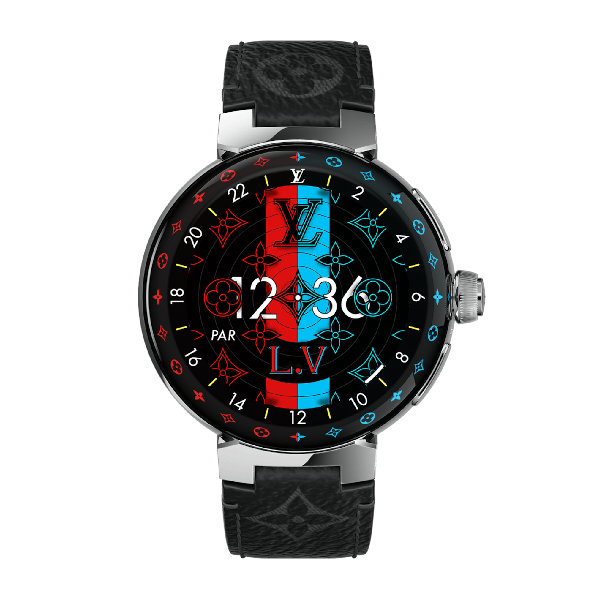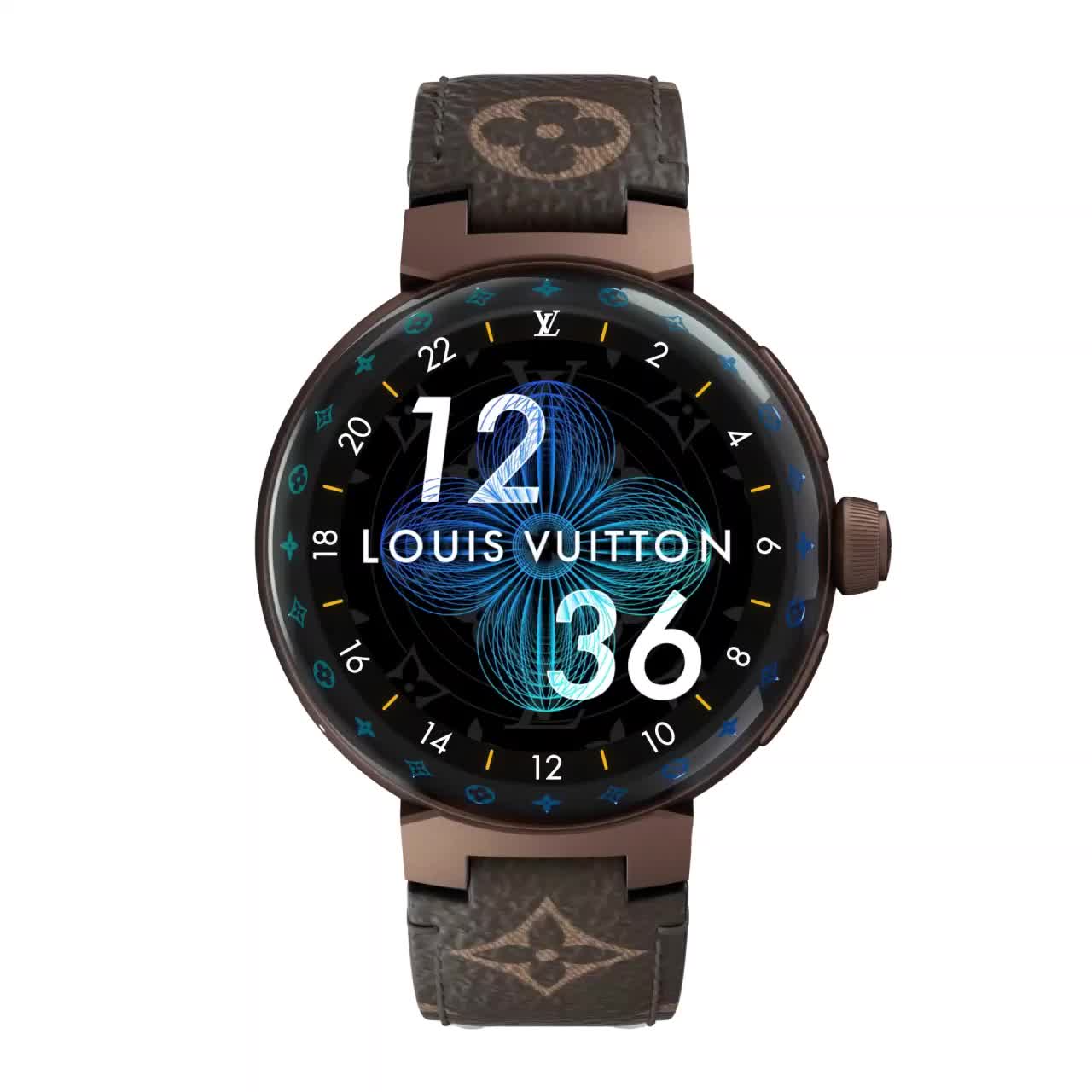 Sobre el borde, 24 luces LED iluminan el emblemático anillo Louis Vuitton Monogram, como un caleidoscopio de colores que crea una fascinante animación en la oscuridad cada vez que se enciende el reloj.