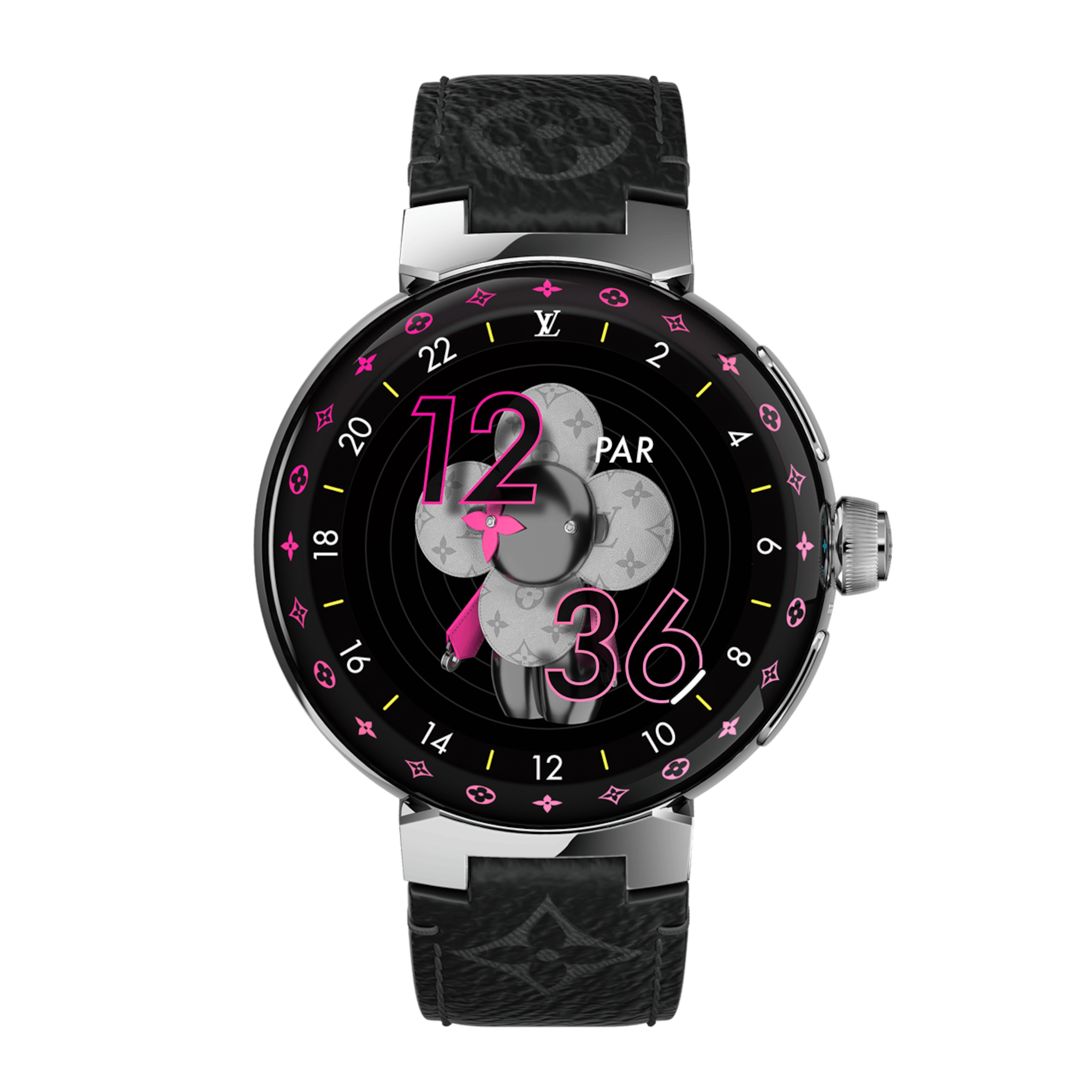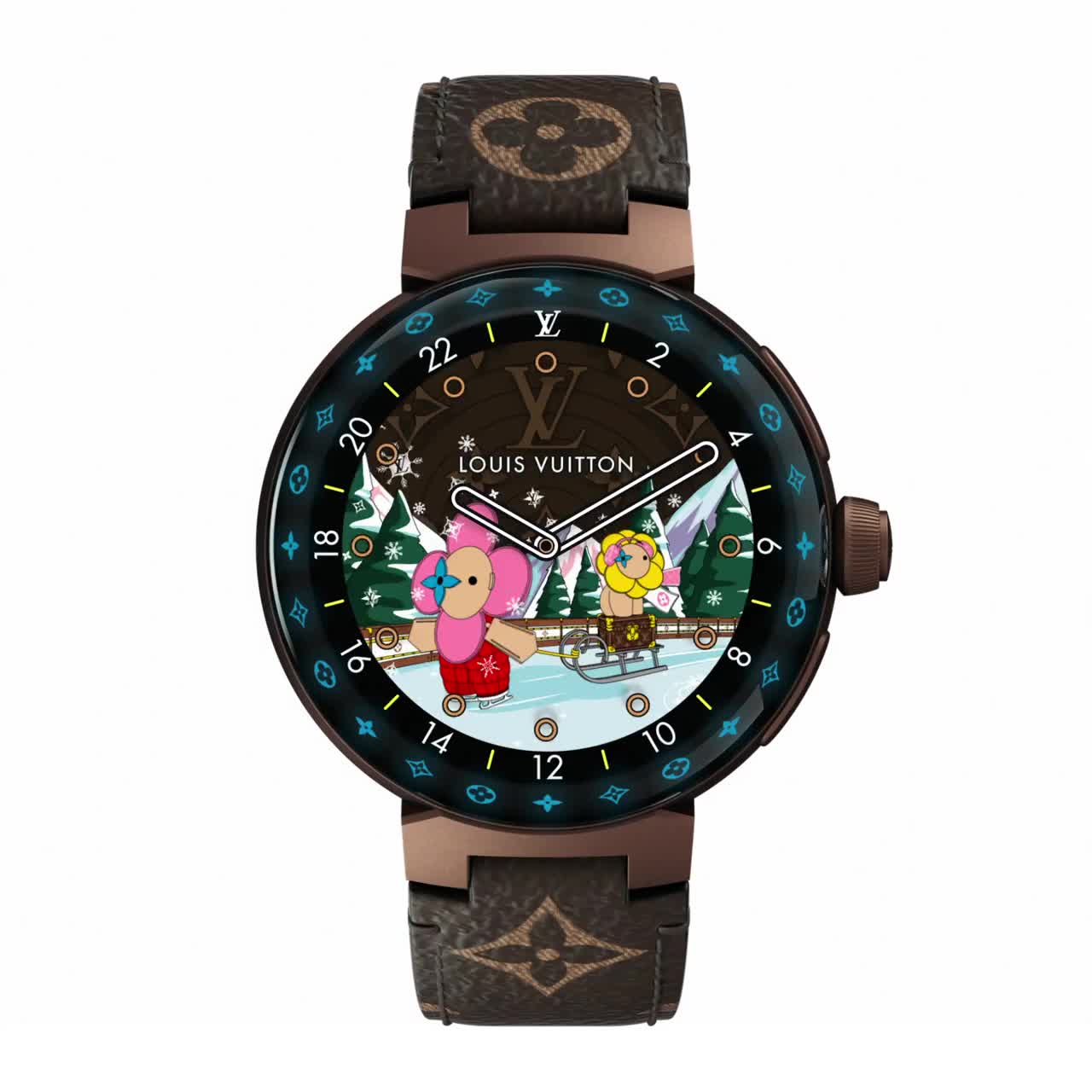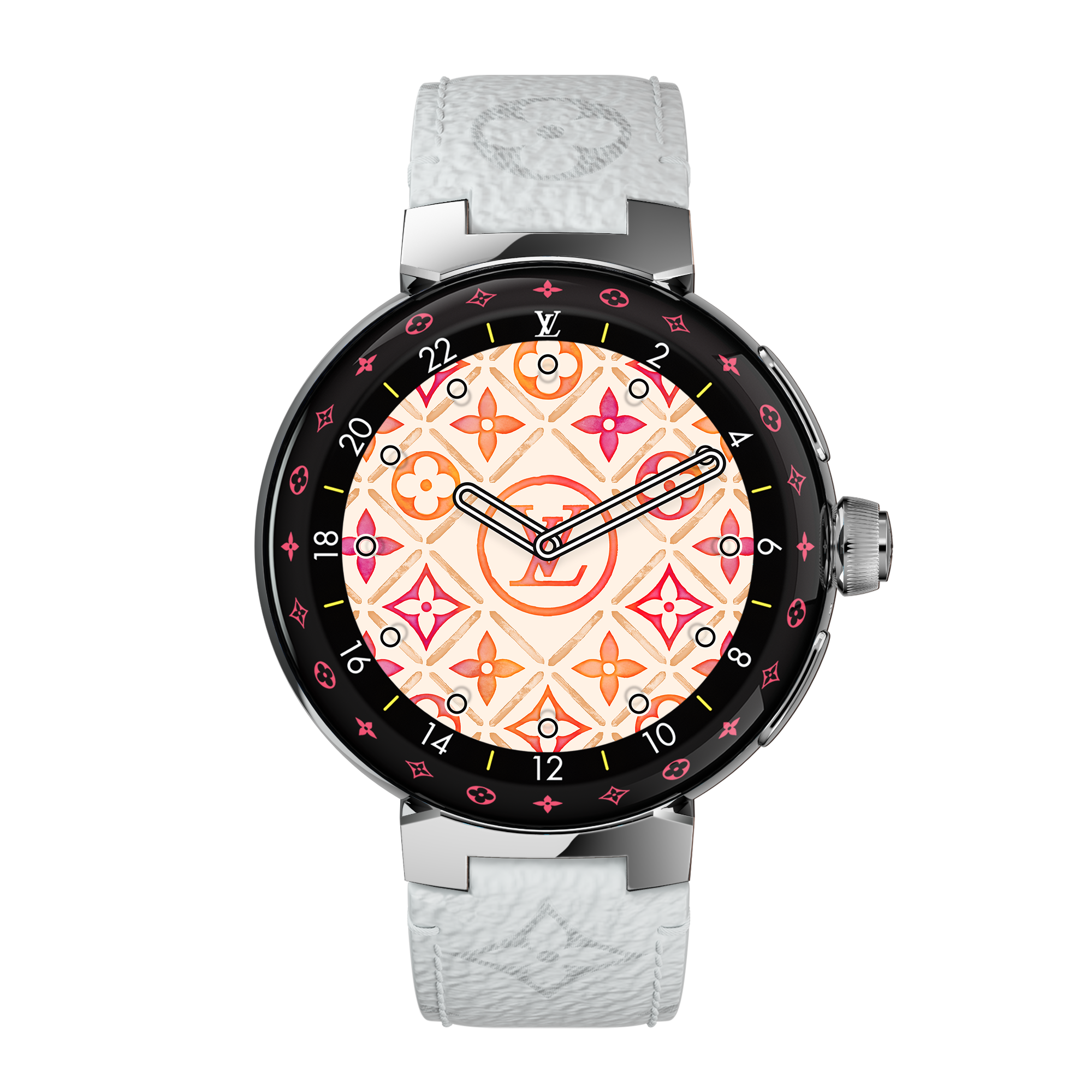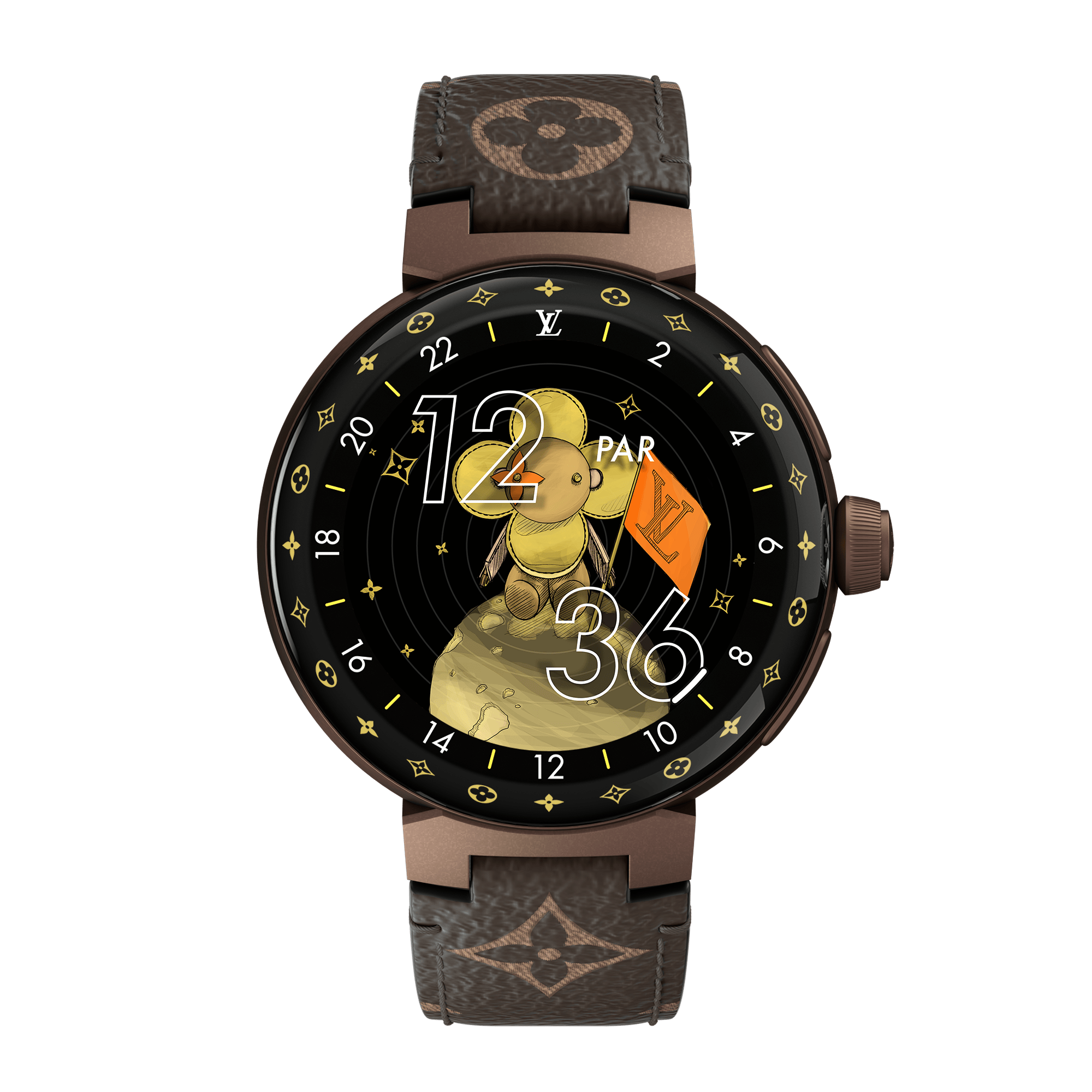 Sobre el borde, 24 luces LED iluminan el emblemático anillo Louis Vuitton Monogram, como un caleidoscopio de colores que crea una fascinante animación en la oscuridad cada vez que se enciende el reloj.