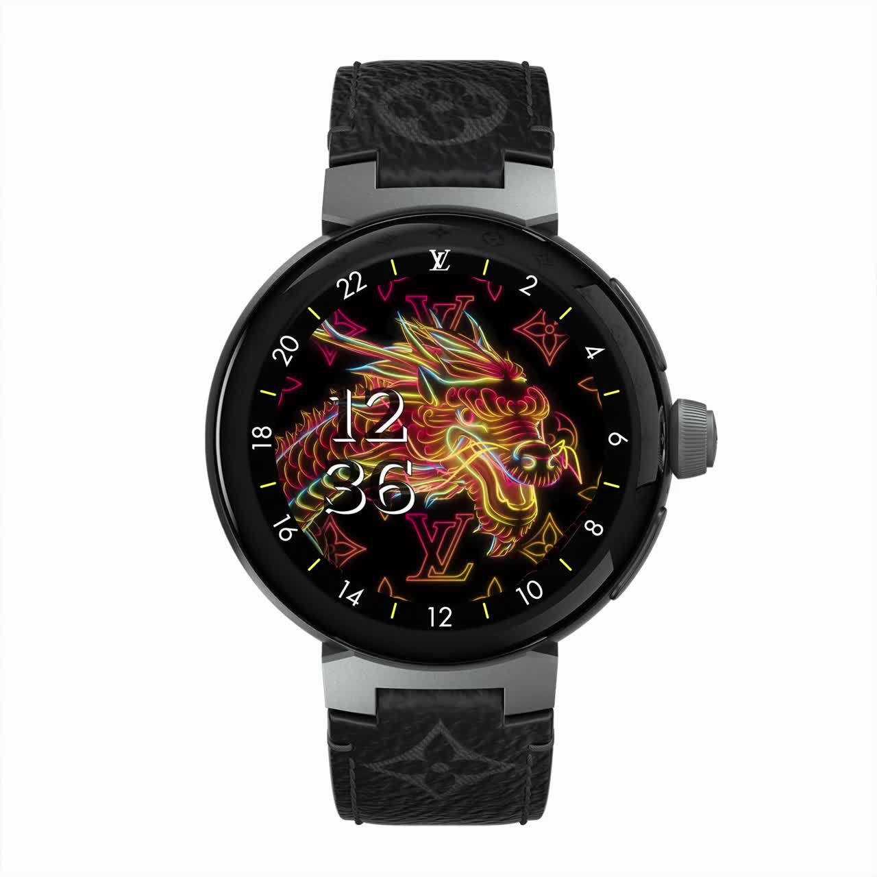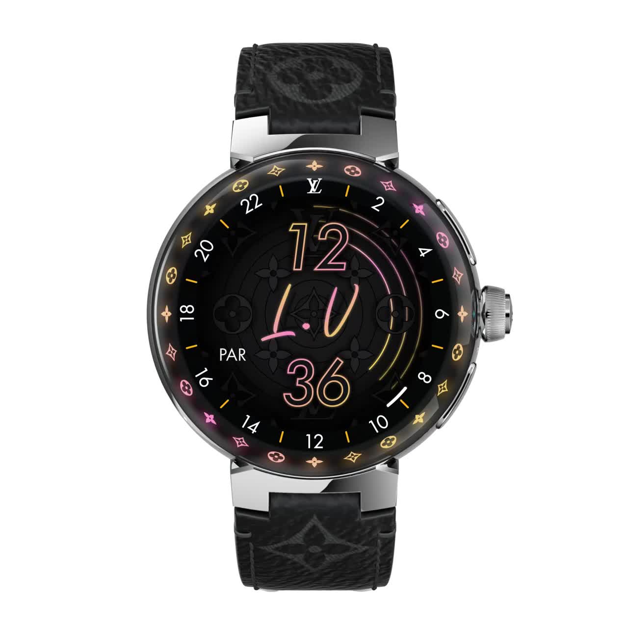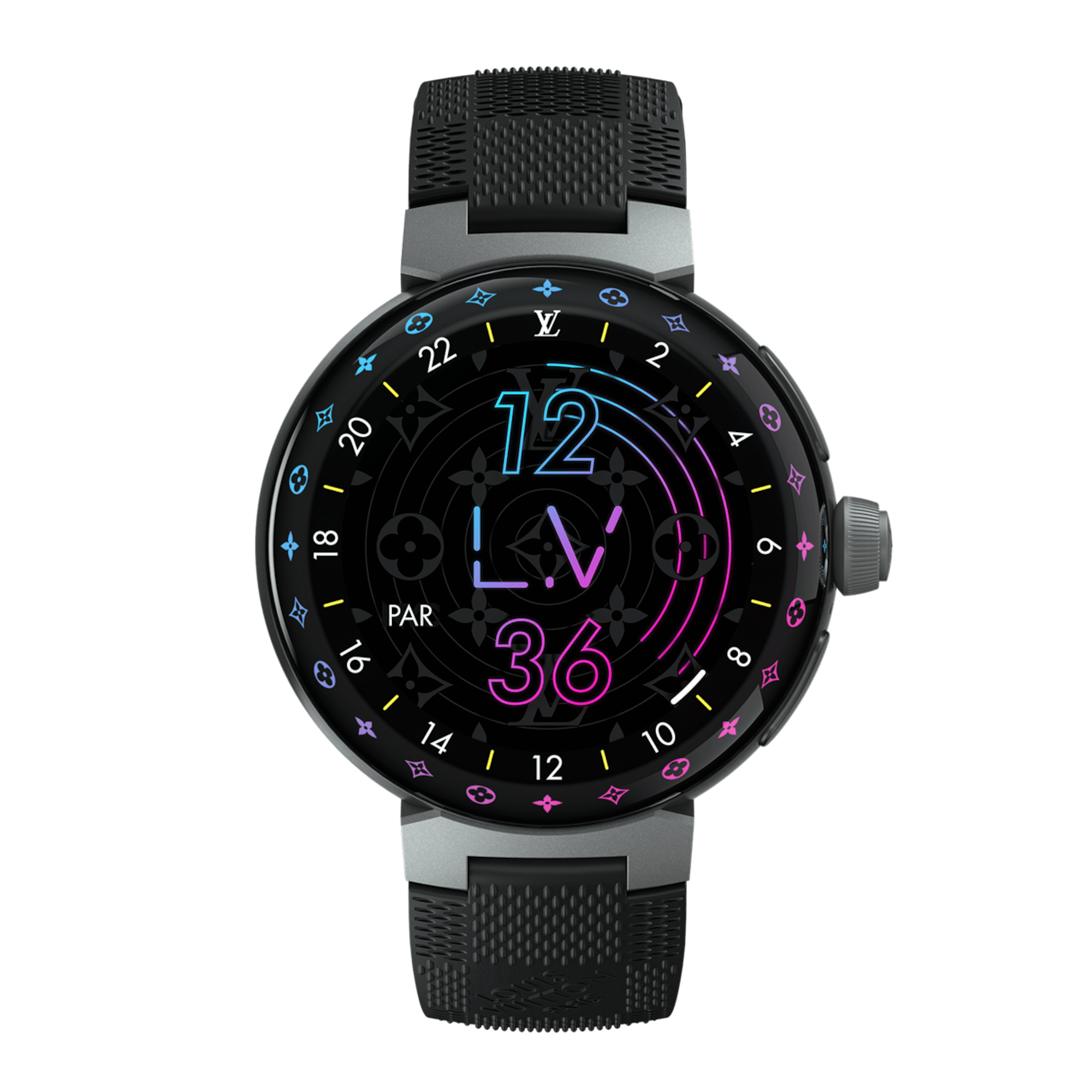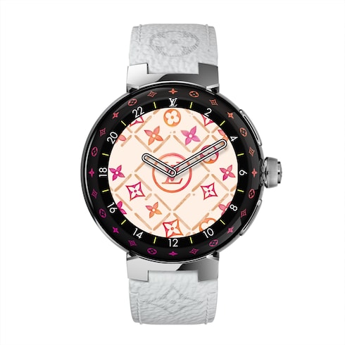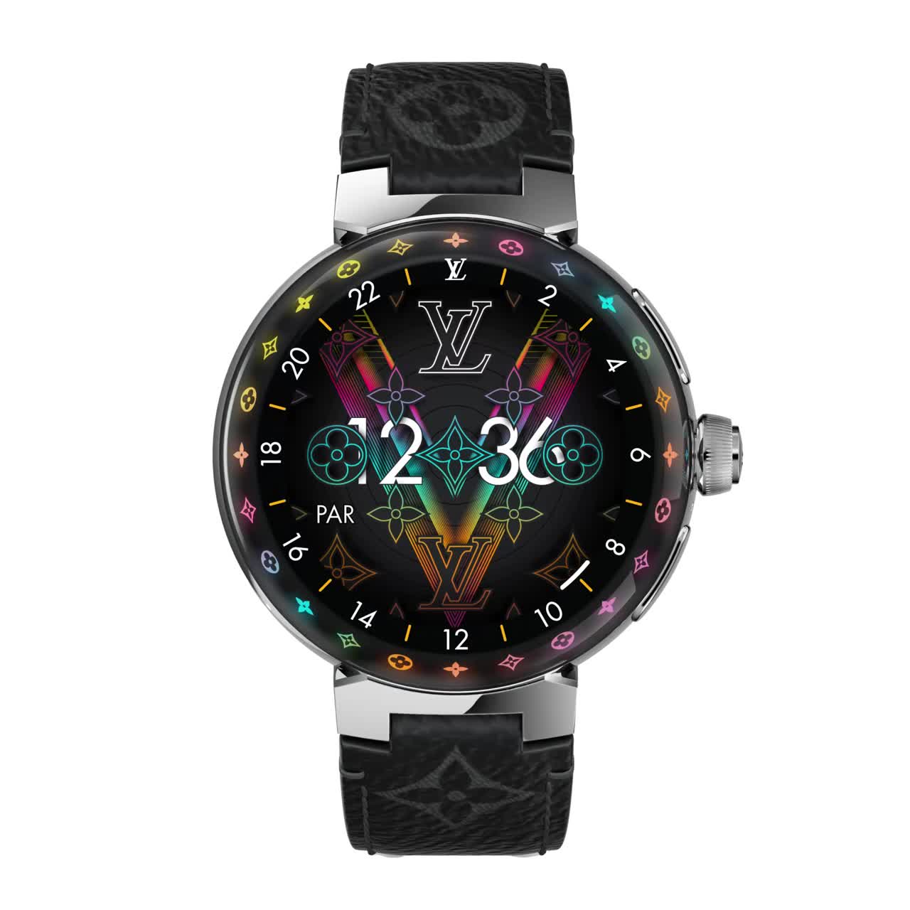 Sobre el borde, 24 luces LED iluminan el emblemático anillo Louis Vuitton Monogram, como un caleidoscopio de colores que crea una fascinante animación en la oscuridad cada vez que se enciende el reloj.