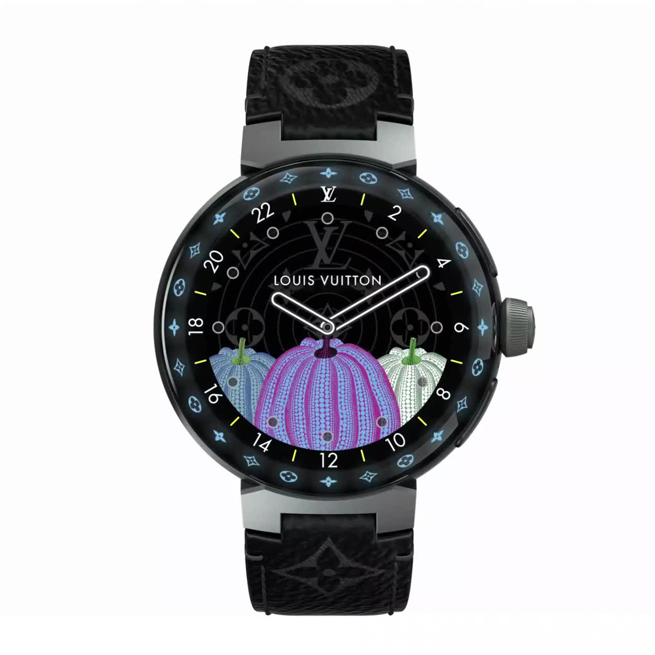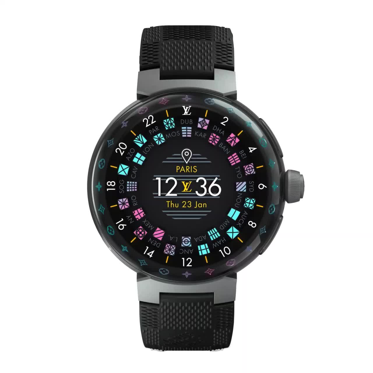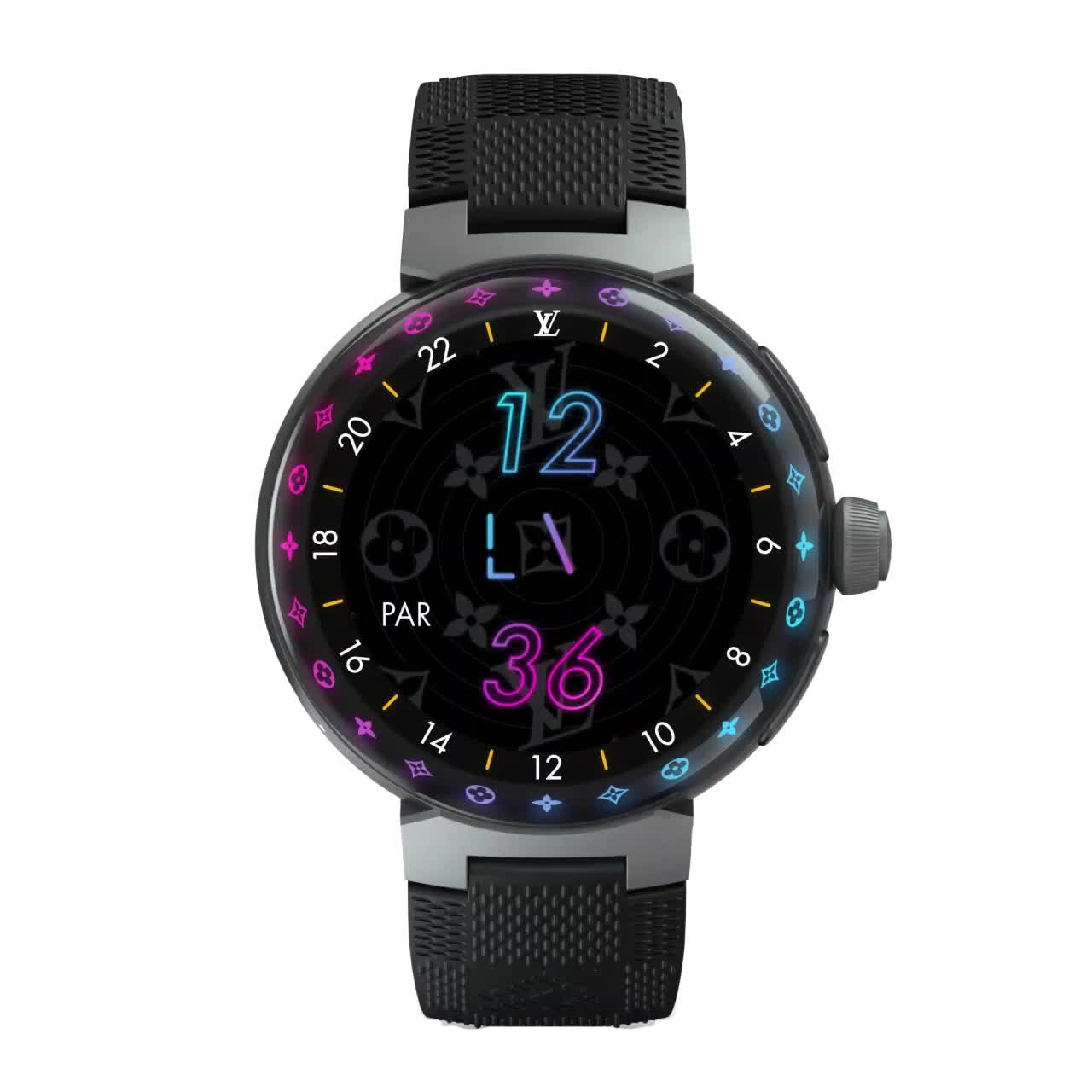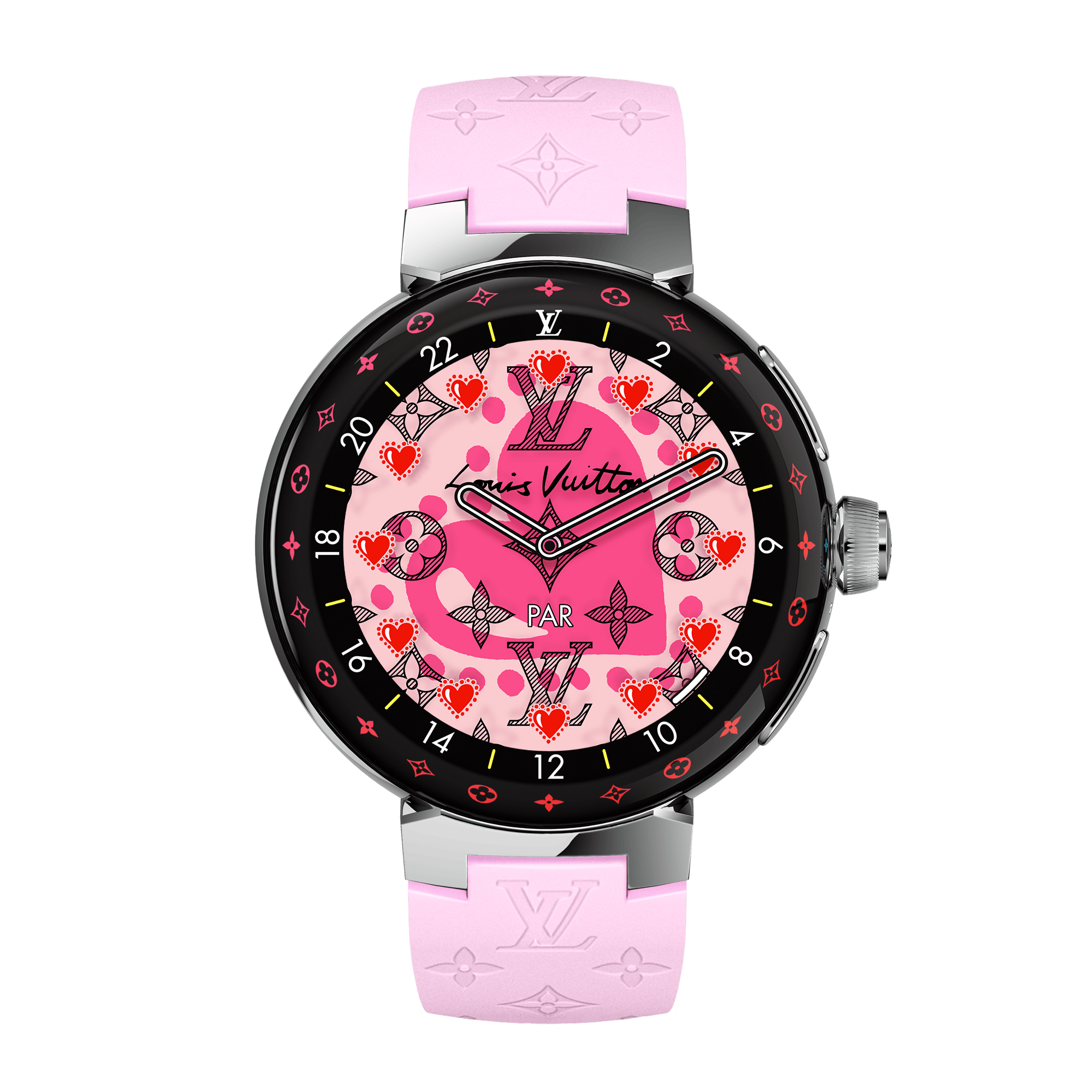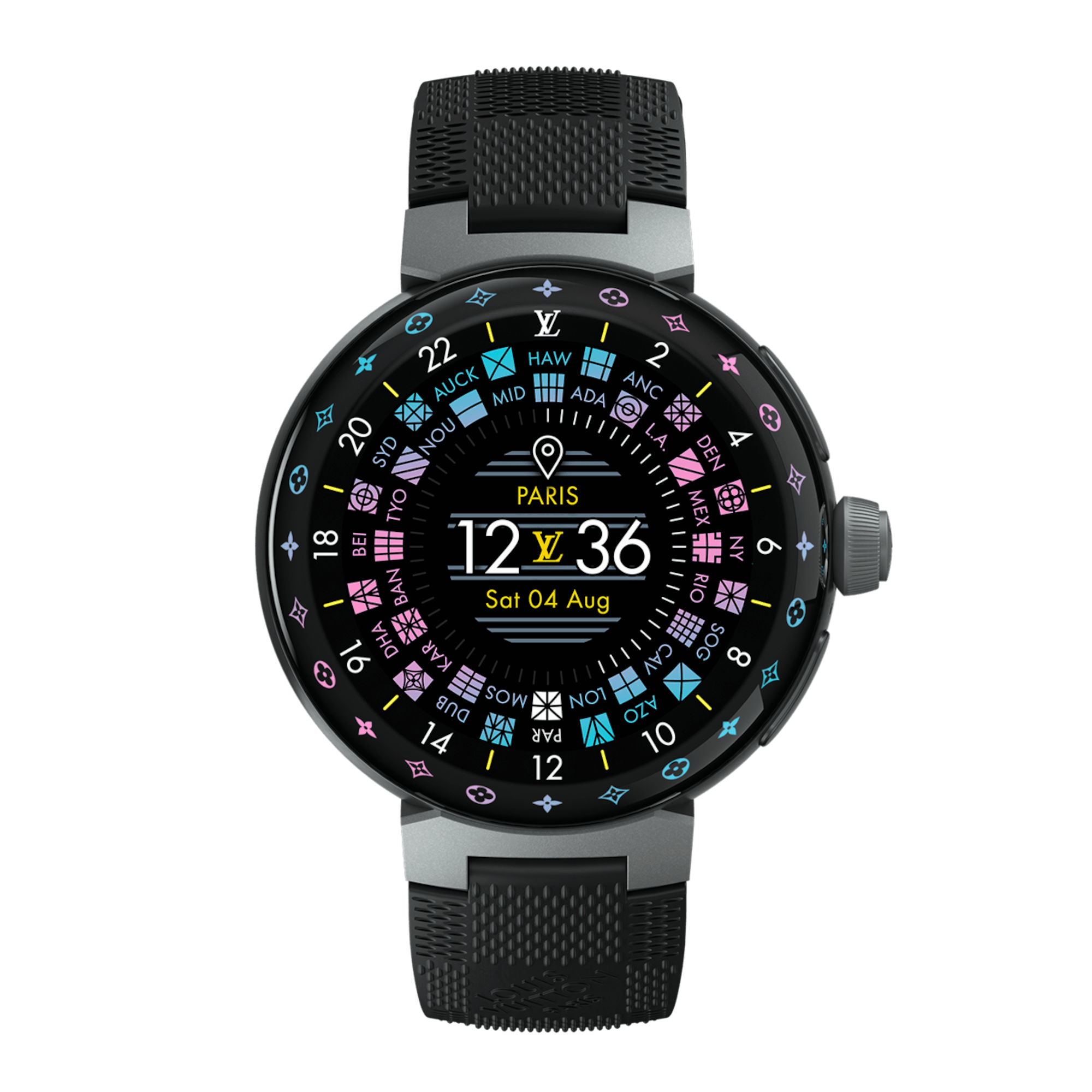 Sobre el borde, 24 luces LED iluminan el emblemático anillo Louis Vuitton Monogram, como un caleidoscopio de colores que crea una fascinante animación en la oscuridad cada vez que se enciende el reloj.