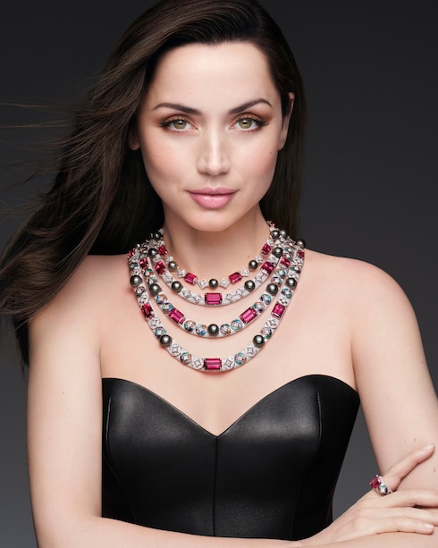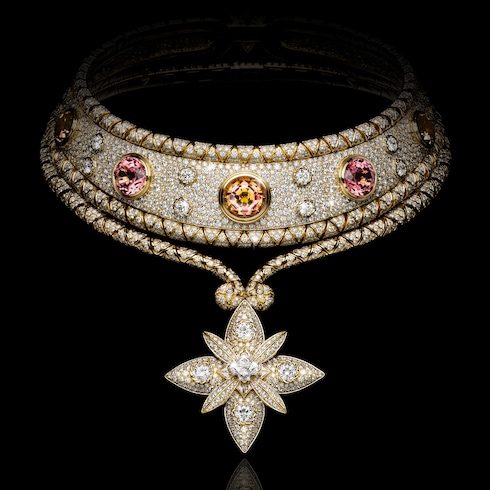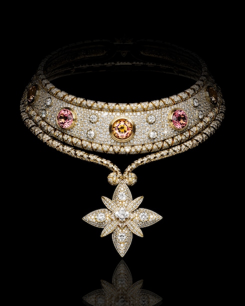 Un brillante homenaje a la elegancia femenina, Aura celebra la Flor Monogram, un icono de la Maison a través de suaves tonos rubor y luminosos contrastes. Las turmalinas bicolores reflejan tanto la fuerza como la delicadeza, formando un halo radiante de luz creativa que dirige el viaje del artista por un camino iluminado de visión e iluminación.