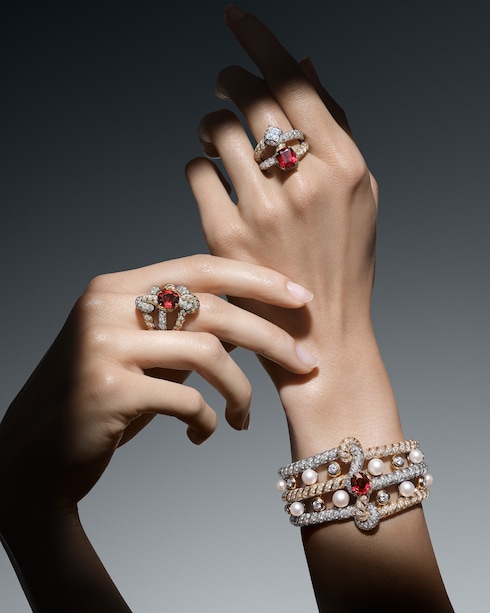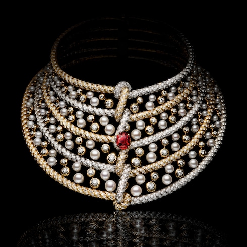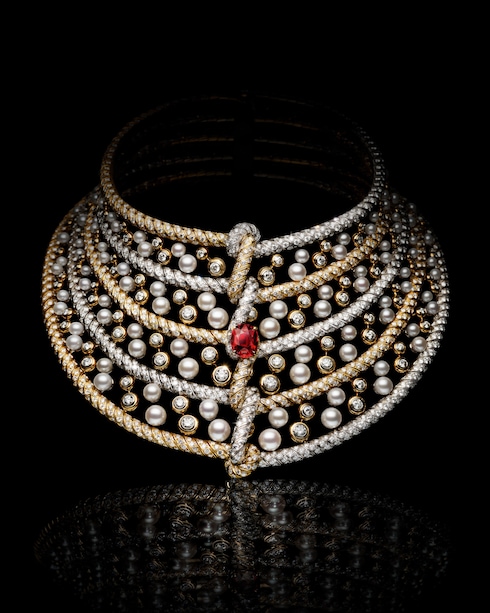 Connection representa una puerta a la creatividad infinita, donde el savoir-faire se convierte en un pasaje hacia la imaginación sin límites y la innovación audaz. Transformando la maestría en posibilidades ilimitadas, un collar compuesto por cinco hilos de diamantes y perlas encarna la armonía del virtuosismo técnico y el brillo creativo, realzado por un extraordinario rubí Pigeon Blood de 6,04 quilates.
