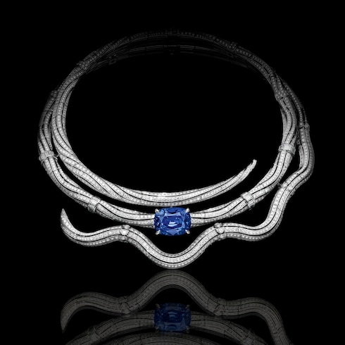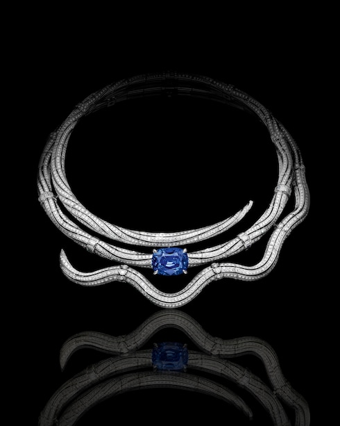 Motion captura la creatividad en continuo avance, llevándose todo a su paso. Un majestuoso zafiro de 35,69 quilates enmarca una corriente de diamantes, encarnando el pulso de la invención. En esta poderosa expresión, el movimiento se convierte en significado, un paso audaz en el ritmo de la creación.
