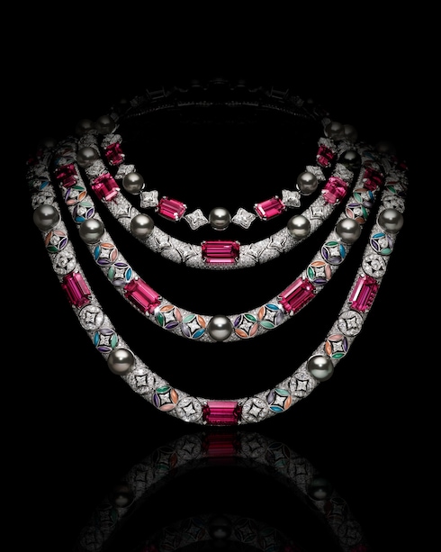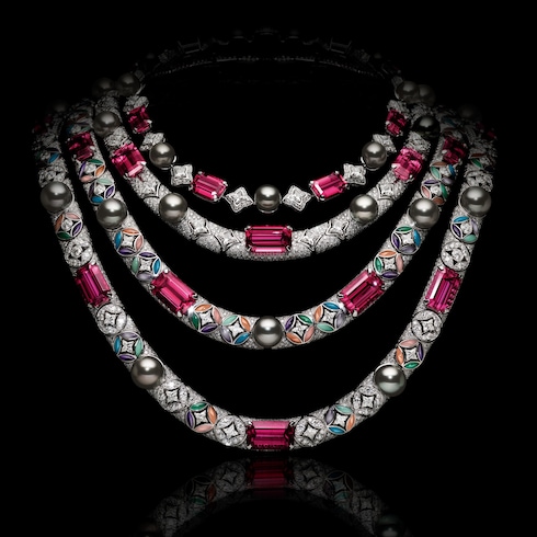 Floración de la creatividad, Florescence representa la metamorfosis de la inspiración inesperada. Reimaginando con vibrante audacia los motivos Monogram Flower y Kite, evoca los códigos icónicos de la Maison. Las turmalinas indicolita y rubelita florecen en armonioso contraste, revelando un poderoso y refinado juego de colores y formas: 12 indicolitas que suman 174,63 quilates y 20 rubelitas para 164,18 quilates. Anclada por un diseño versátil con filas desmontables, la pieza evoca el movimiento y la transformación.