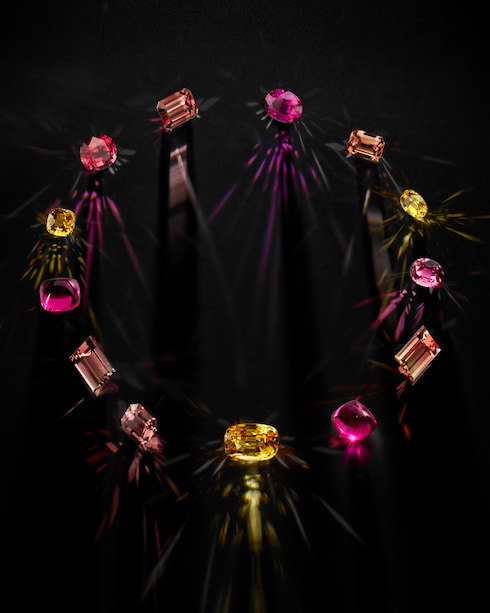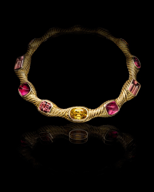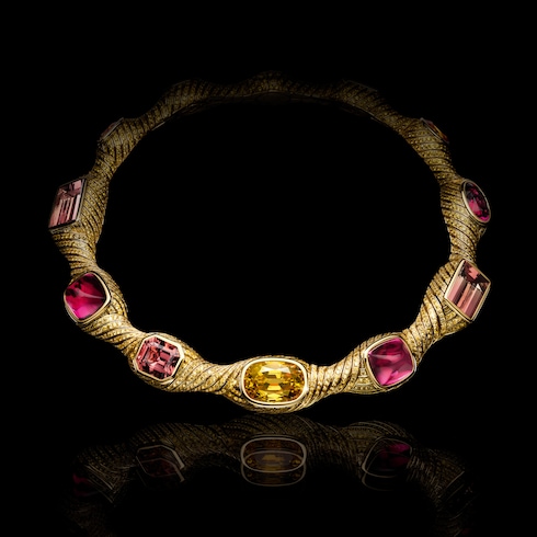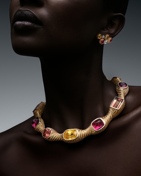 Un alegre estallido de colores vibrantes, Joy irradia abundancia y exuberancia. La creatividad se transforma en una poderosa ola cromática, cuerdas en espiral de oro amarillo se enroscan alrededor de vívidos zafiros de más de 40 quilates y turmalinas de más de 20 quilates, en diversas formas y cortes, representando un total de 204,63 quilates , una silueta dinámica que celebra la libertad y la alegría de la creación audaz.