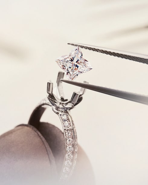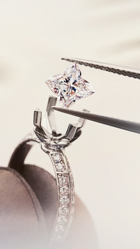 Un equipo de artesanos especializados talla y pule el diamante en Bélgica o la India, dos de las capitales históricas de las piedras preciosas del mundo con una tradición inigualable en el perfeccionamiento de las piedras. Ya sea como brillante clásico o como la distintiva forma LV Monogram Star, cada diamante requiere una artesanía y un savoir-faire extraordinarios para darle su forma multifacética final y su aspecto brillante.