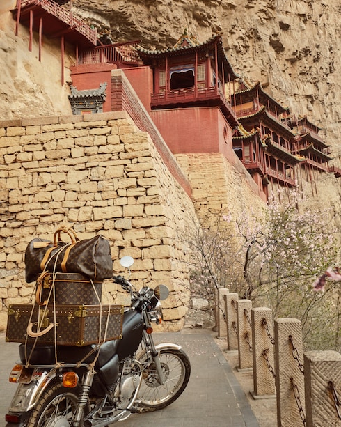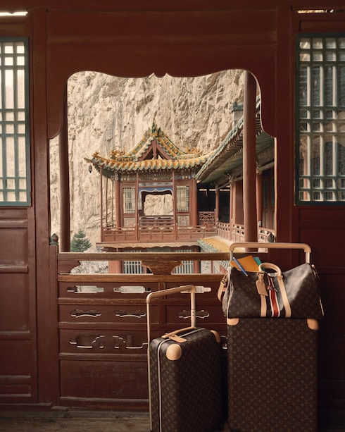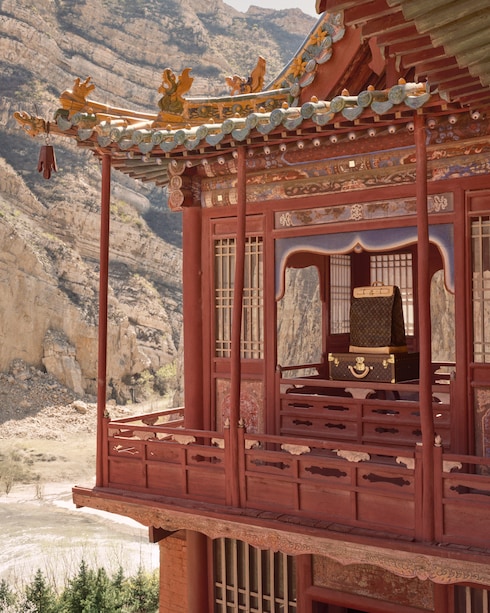 Continuando hacia el este, la Maison presenta sus icónicos bolsos Speedy y Steamer en el interior de la arquitectura única del templo colgante de Xuan Kong, en la región de Datong, que celebra una obra maestra de artesanía atemporal, situada en lo alto de un acantilado.