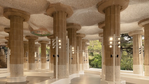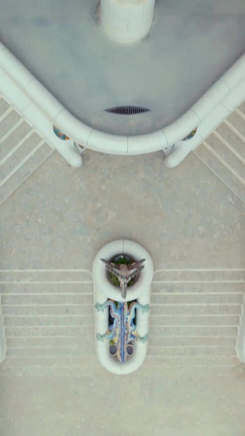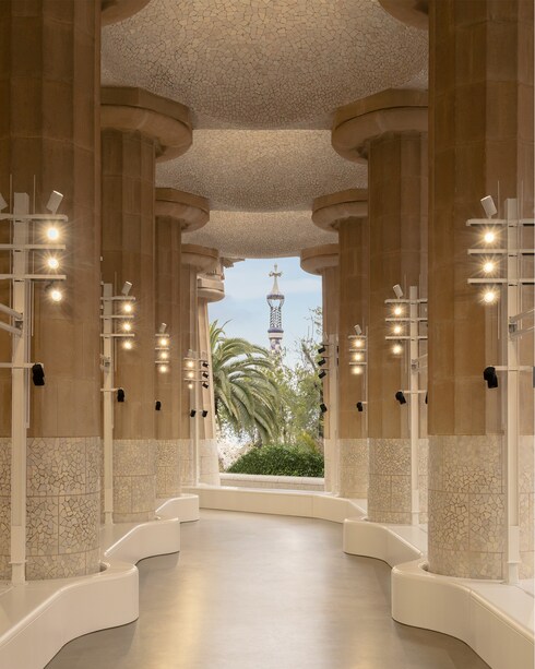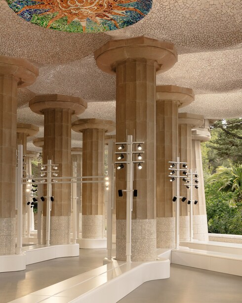 Imaginada por el arquitecto Antoni Gaudí, la estética vanguardista que fusiona naturaleza, piedra y mosaicos se hace eco del espíritu visionario de Louis Vuitton, creando un cautivador escenario realzado por la escenografía curvilínea de James Chinlund.