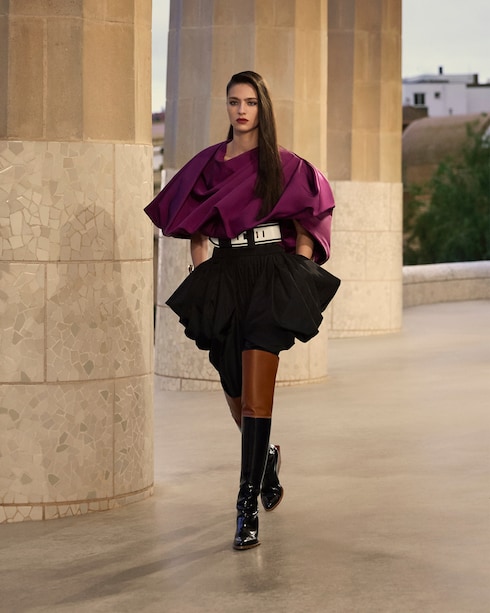 Entre sastrería estructurada y siluetas fantasiosas realzadas por claroscuros gráficos, Nicolas Ghesquière sumerge su universo creativo en influencias españolas, creando un encanto polifacético a través de un viaje emocional de descubrimiento.