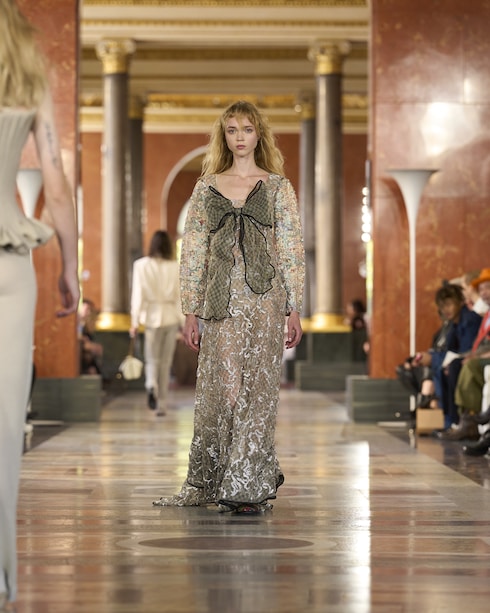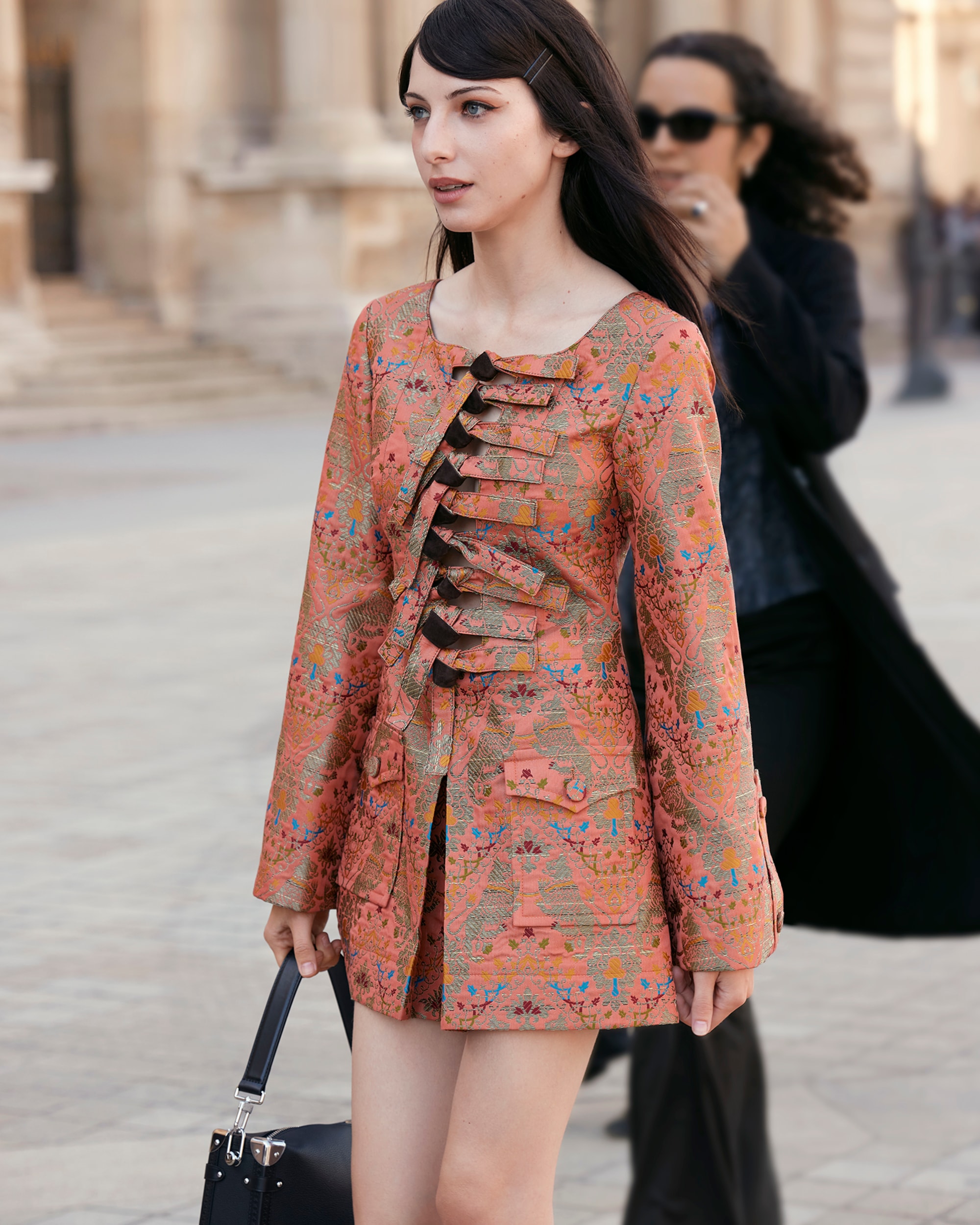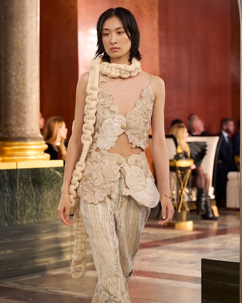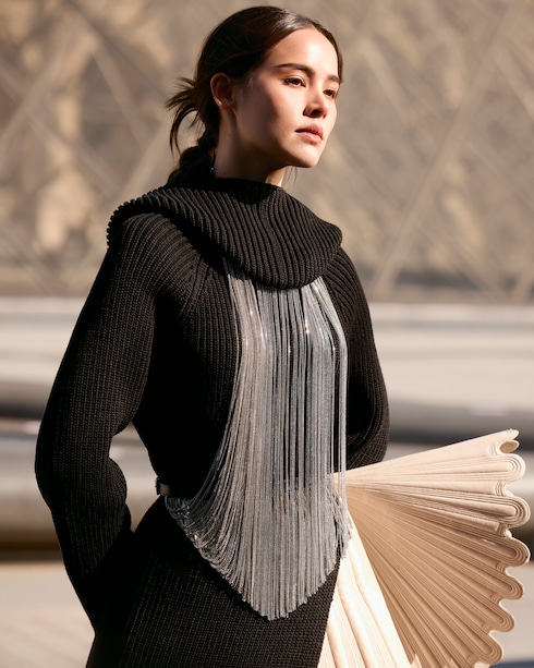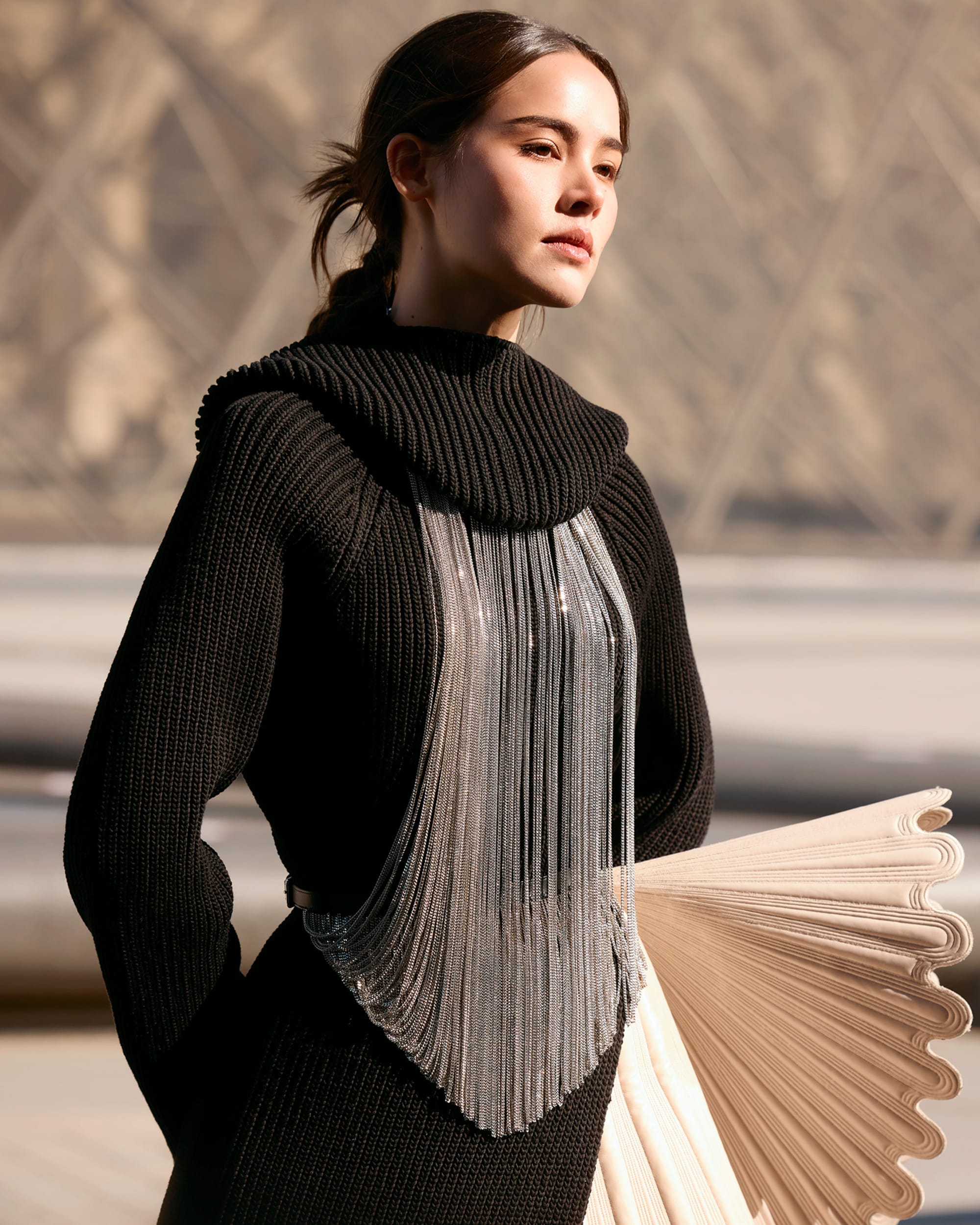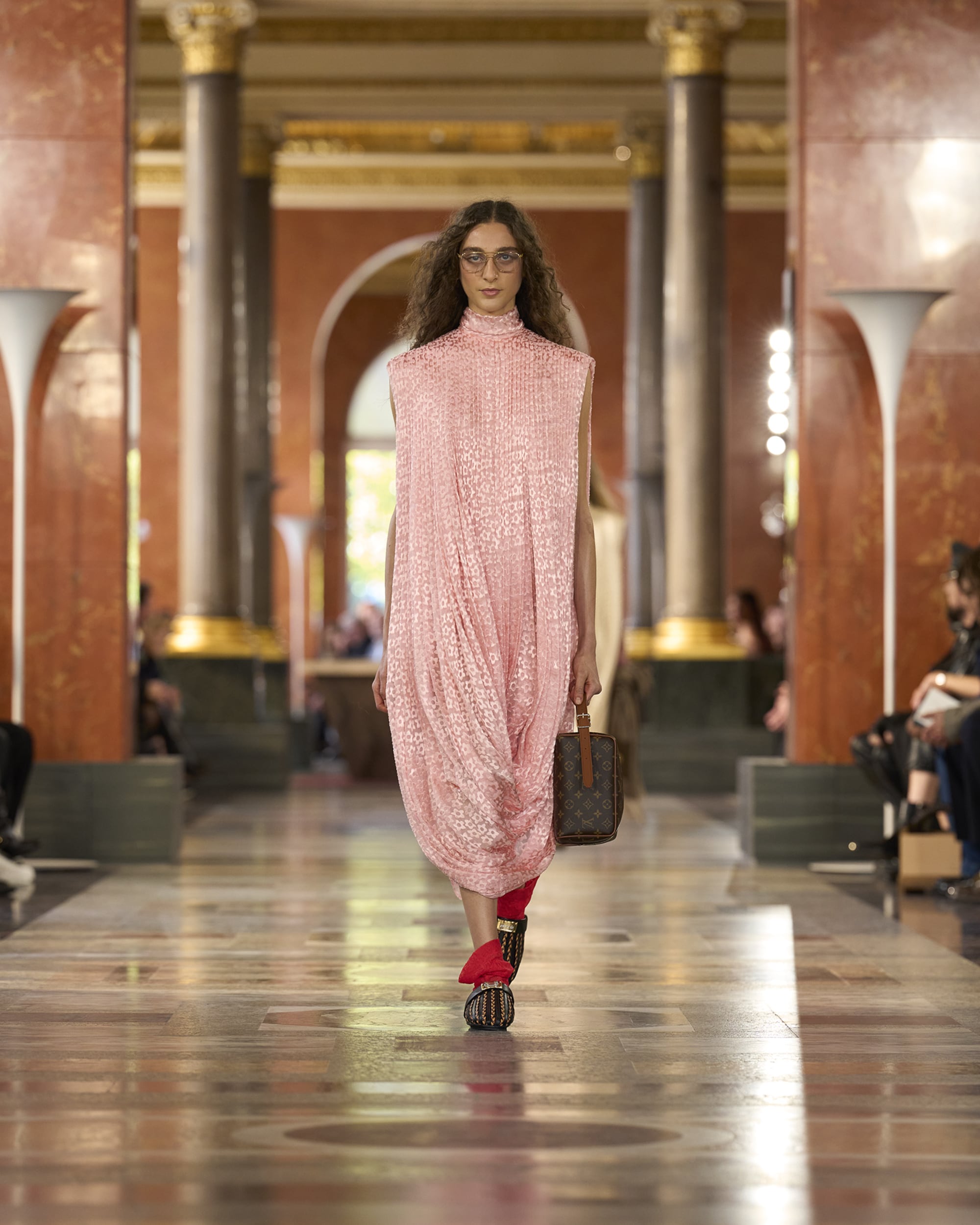 En el corazón de la vivienda de verano de Ana de Austria en el Museo del Louvre, la última colección de Nicolas Ghesquière presenta un armario de creaciones llenas de textura y drapeados, fusionando arte con estilo.