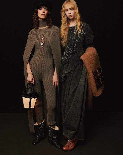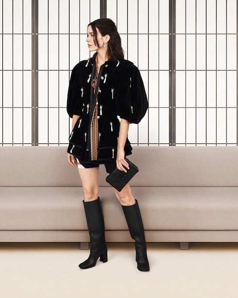 Retomando la herencia viajera de Louis Vuitton, Nicolas Ghesquière fusiona pasado y presente con su audaz firma estética. En un juego de volúmenes, texturas y motivos, la colección redefine la elegancia moderna a través de una miríada de siluetas con contrastes.