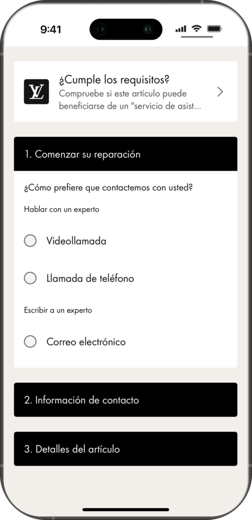 Abra la LV App para reservar cita con un Experto de cuidado o rellene una solicitud de reparación.