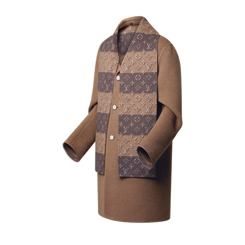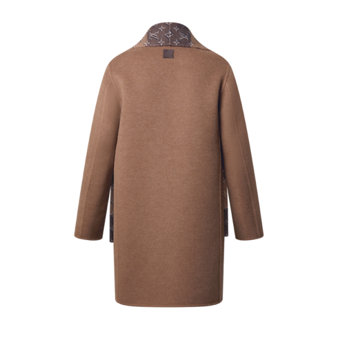 Este abrigo de doble cara, confeccionado en lujosa mezcla de lana, cachemir y seda, se distingue por un versátil exterior de color marrón caramelo. El interior se adorna con un refinado motivo Monogram Heritage realizado en Jacquard, también presente en la bufanda extraíble. Esta prenda de diario, con un corte amplio ligeramente estructurado, se completa con un adorno LV tipo joya en el pecho y un cierre de botones con efecto nacarado.