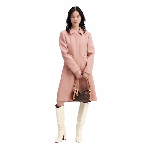 Este abrigo midi ajustado, confeccionado en lujoso crepé de lana de doble cara y forrado en seda Monogram, destaca por su estilo elegante y atemporal. La cintura entallada se realza con detalles tipo cinturón en piel tono sobre tono, mientras que las costuras princesa estilizan la figura. La prenda se completa con un refinado cuello plano y un sobrio cierre de botones ocultos.