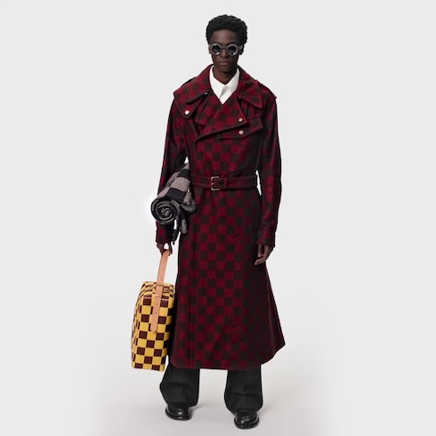 Este llamativo abrigo largo de estilo utilitario, visto en el desfile Primavera-Verano 2024, está confeccionado en tejido denim. Luce un motivo gráfico Damier Pop realizado en Jacquard con unas discretas inscripciones «Marque L. Vuitton déposée», que brindan un toque refinado. Se completa con un cinturón para crear una silueta definida, y un logotipo LV Lovers reproducido con tachuelas en la parte trasera.