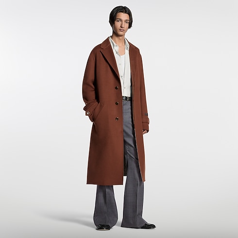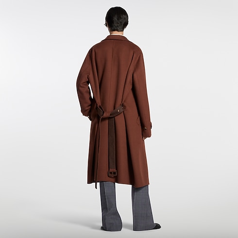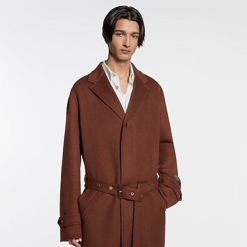 Este abrigo con cinturón presentado en el desfile Primavera-Verano 2026, confeccionado en lana y seda, encarna la elegancia informal de la temática Indian Dandy de la colección. Luce una silueta fluida de doble cara adornada con un motivo gráfico LV Maze realizado en Jacquard en el interior, inspirado en los carteles publicitarios de la India. Un parche en piel marrón con el logotipo Louis Vuitton Paris en relieve aporta un toque final a la manga izquierda.