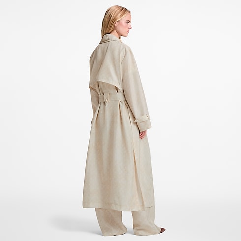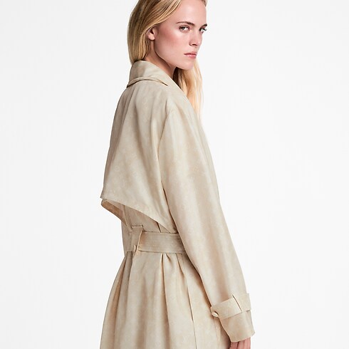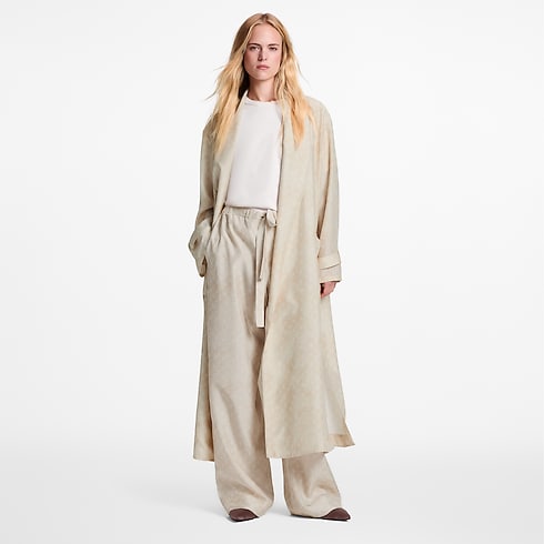 Este elegante y versátil abrigo largo, confeccionado en ligera seda en un suave tono de temporada, luce un estampado Monogram. Su diseño fluido de corte vaporoso presenta un refinado cuello con muescas y dos prácticos bolsillos de parche en los laterales. Se completa con un fino cinturón con anilla en forma de D, que realza la cintura.