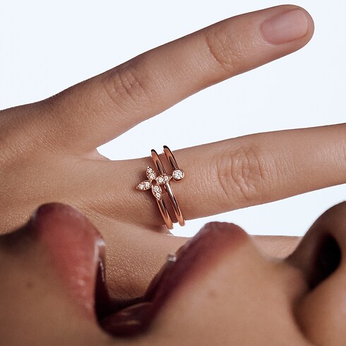 El anillo Idylle Blossom Multi combina un motivo icónico de Louis Vuitton y un original diseño en espiral. El modelo, elaborado en oro rosa y realzado con nueve radiantes diamantes, luce una flor Monogram en forma de estrella y un fino círculo, un símbolo del infinito y del movimiento perpetuo. Esta moderna joya de estilo femenino añade un delicado toque de elegancia a cualquier look de diario o de noche.