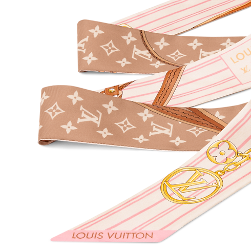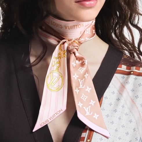 La bandana My Neverfull BB de seda, inspirada en el emblemático bolso Neverfull, rinde homenaje al legado de la Maison en la fabricación de equipaje. Su atrevido y gráfico motivo evoca los forros de lona a rayas del bolso Neverfull, y se realza con una ilustración del histórico parche «Articles de Voyage». Se completa con logotipos LV Circle y flores Monogram, que aportan un toque distintivo adicional.