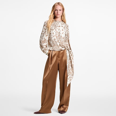 Esta blusa, elegante y moderna, se ha confeccionado en vaporosa sarga de seda con un romántico motivo de rayas y flores realizado en Jacquard. Presenta unas mangas largas con fruncidos en los hombros para acentuar la fluidez, así como un lazo anudado en la parte izquierda de la cadera que cae delicadamente hacia un lado. Se completa con un refinado cierre de lágrima en la espalda.
