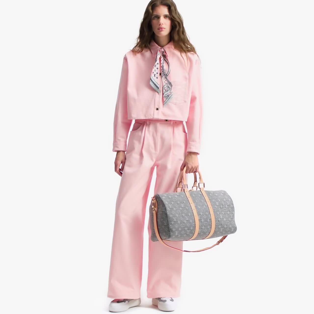 Esta refinada bolsa de viaje Keepall 45 está confeccionada en tejido denim Monogram de algodón en tonos suaves, que combinan a la perfección con el ribete en piel natural y las piezas metálicas de color dorado pálido. Incluye remaches en las bandas laterales que recuerdan a los baúles vintage de la Maison. Las elegantes asas superiores y la bandolera ajustable y extraíble permiten llevarla de diferentes formas.