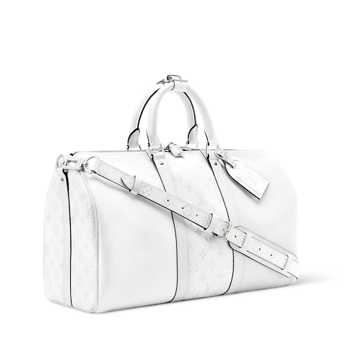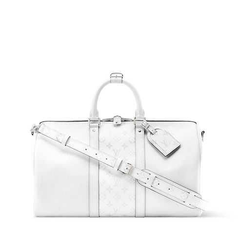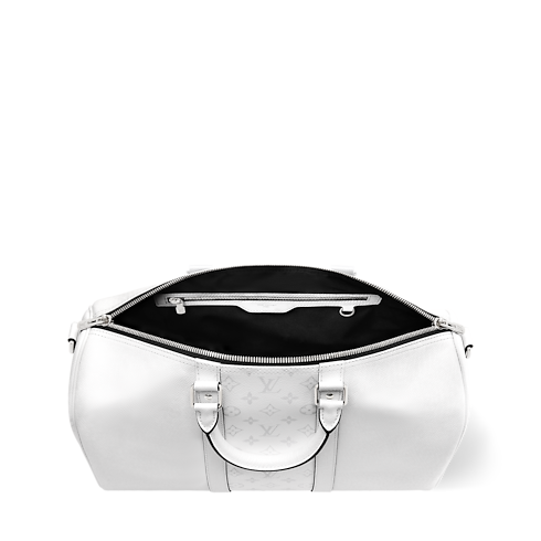 Esta bolsa de viaje Keepall 45 está elaborada en lona Monogram revestida y piel Taïga a juego. El diseño tono sobre tono se combina con piezas metálicas plateadas para crear una estética contemporánea. Este práctico accesorio incluye dos asas superiores enrolladas en piel y una bandolera ajustable y extraíble, que permiten llevarlo de múltiples formas.