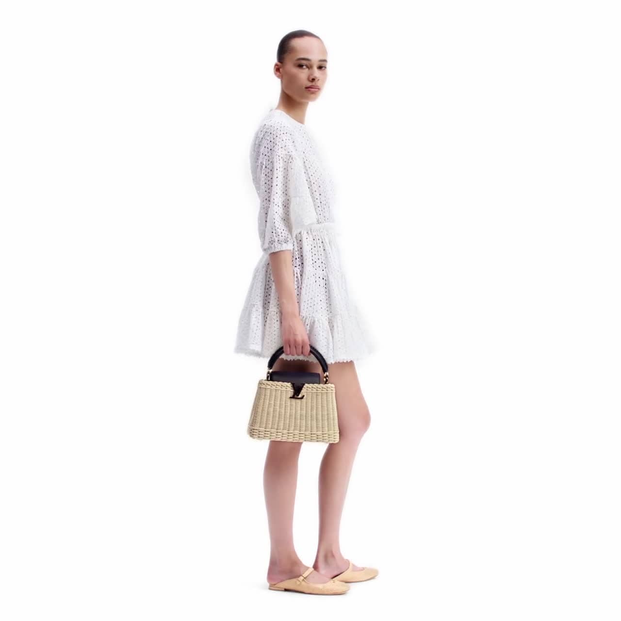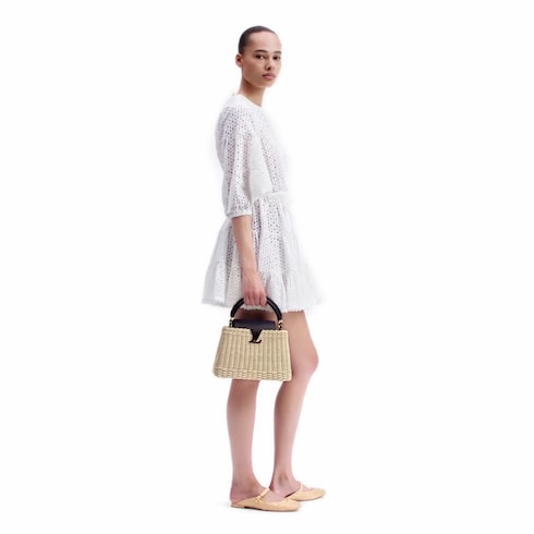 Este bolso Capucines BB se ha tejido a mano en ratán, un proceso que requiere dos días de trabajo y hace que cada pieza sea única. Su diseño, inspirado en las escapadas estivales y la cesta Picnic de la Maison de 1892, incluye un forro estampado y un logotipo LV Initials. Este accesorio, que puede lucirse con la solapa por fuera o por dentro, cuenta con capacidad suficiente para guardar los imprescindibles de diario.