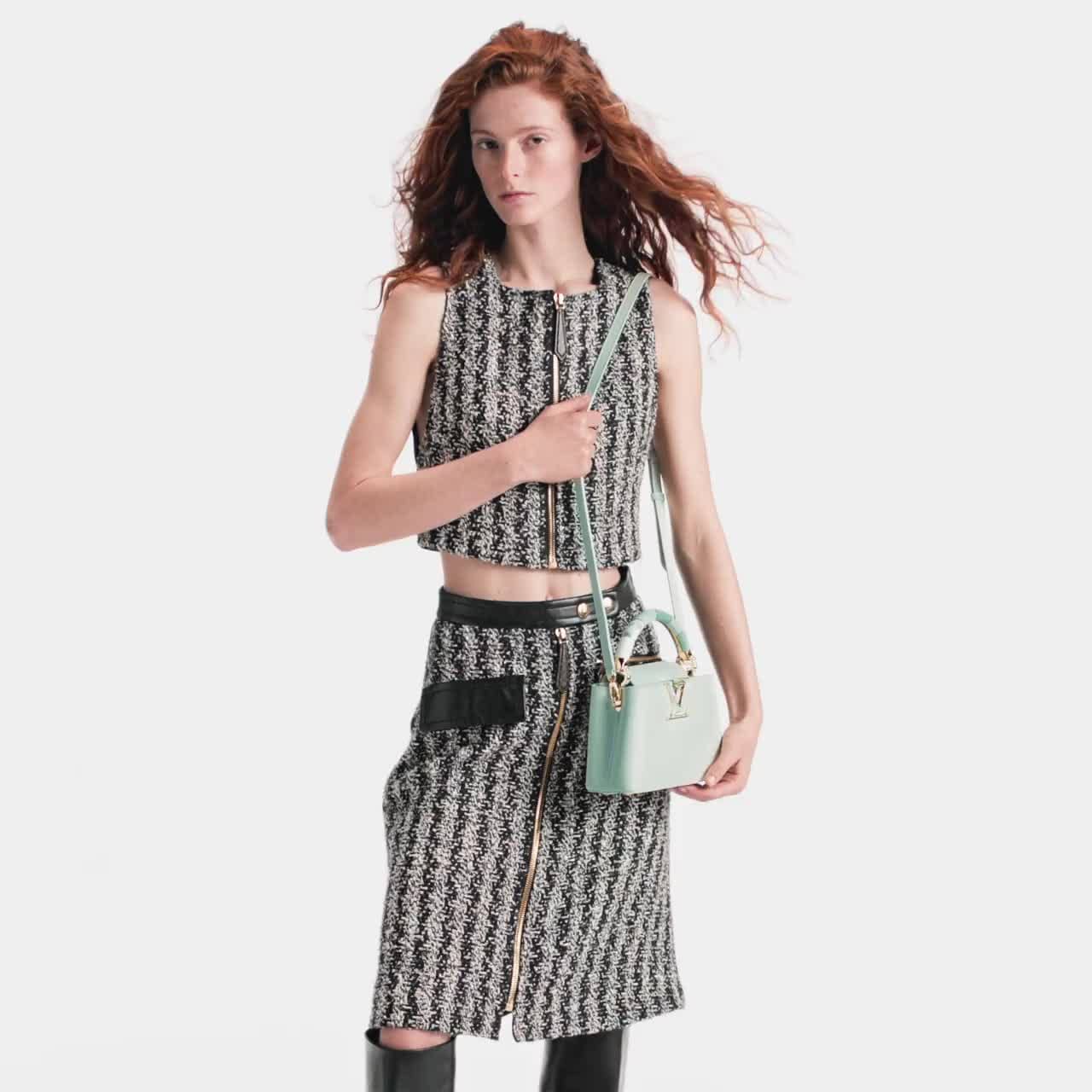 Esta refinada versión del bolso Capucines Mini para la temporada Primavera 2023 está confeccionada en piel Taurillon de color verde pálido. El asa tipo joya, inspirada en el arte japonés del kintsugi, se presenta en preciada piel de serpiente Karung, pieles suprarrecicladas y resina. Este delicado accesorio, ideal para looks de día o de noche, luce un emblemático logotipo LV adornado con un romántico motivo floral, que le aporta un exquisito toque femenino.