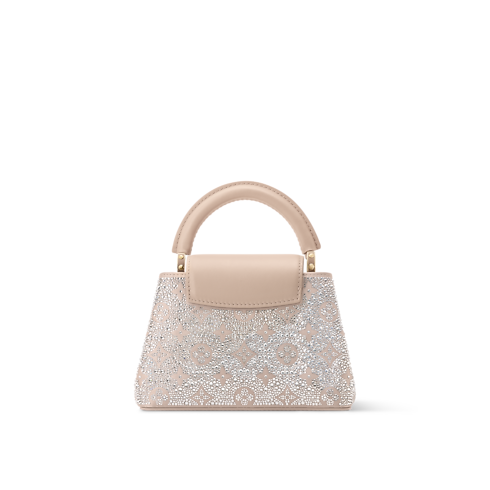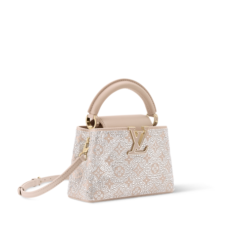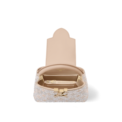 Esta brillante edición del bolso Capucines Mini es una elección elegante para un evento de noche. Perteneciente a la Colección LV Mirage, el modelo está confeccionado en satén y adornado con cristales Swarovski que capturan la luz. El color beige Desert Sand del diseño combina con el logotipo LV Initials tonal, que se aprecia enmarcado por elegantes piezas metálicas doradas. Puede llevarse en la mano, cruzado o al hombro.