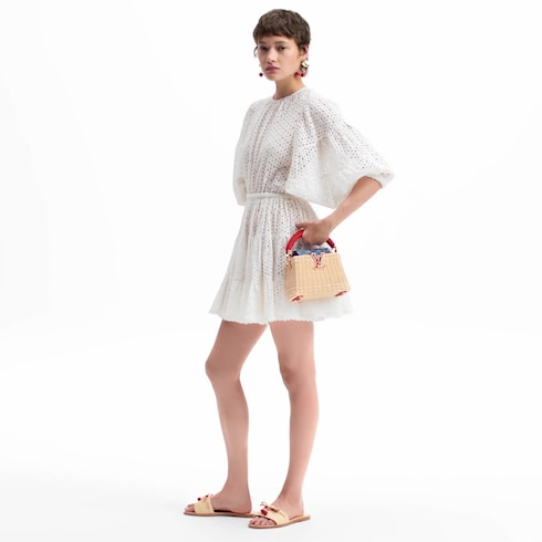 El emblemático bolso Capucines Mini se realza con los detalles alegres y llamativos de la segunda edición de la Colección Louis Vuitton x Murakami. El cuerpo presenta un intrincado diseño en ratán tejido, que aporta un toque veraniego e informal. La solapa superior está confeccionada en tejido denim Monogram adornado con coloridos motivos de cerezas, que hacen juego con el vistoso tono rojo del asa superior, la bandolera trenzada y el logotipo LV Initials.