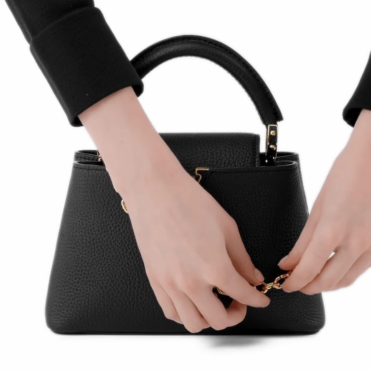 El bolso My Capucines, una nueva edición personalizable de la línea Capucines, presenta un exclusivo tamaño compacto entre los modelos Mini y BB. Este accesorio en piel, disponible en cuatro tonalidades diferentes, incluye una cadena única que puede decorarse al gusto gracias a tres originales colgantes, que lucen letras bigalvanizadas y motivos distintivos de la Maison. Se completa con unas elegantes piezas metálicas de color dorado.