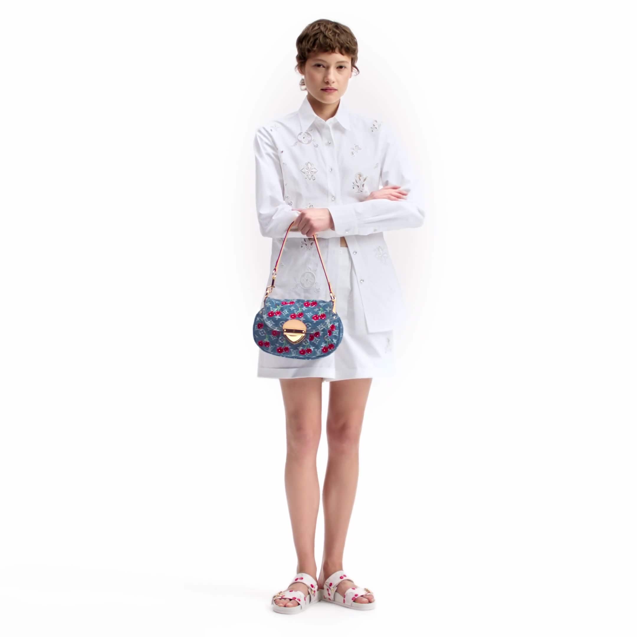 Esta versión del bolso Sunset, parte de la segunda edición de la apreciada Colección Louis Vuitton x Murakami, presenta unos gruesos bordes redondeados que se replican en el cierre de broche oversize dorado. Esta pieza de inspiración vintage, confeccionada en tejido denim Monogram, se adorna con un alegre patrón de cerezas bordado. Se completa con una bandolera en piel natural con tachuelas.