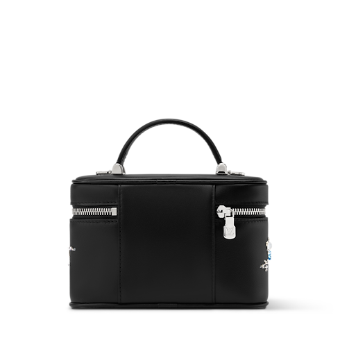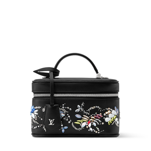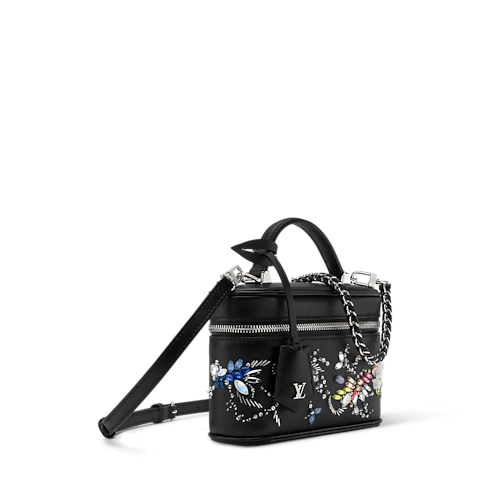 Esta glamurosa versión del bolso Vanity Chain Pouch, parte de la Colección Eden, destaca por su exquisito motivo bordado con gemas y cristales multicolores. La pieza está confeccionado en piel de becerro con un elegante tono negro clásico e incluye una cadena trenzada extraíble de color dorado. Se completa con una etiqueta identificativa en piel, que rinde homenaje a la icónica tradición viajera y destreza artesanal de la Maison.