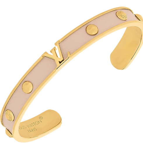 Este llamativo brazalete LV Initiales, elaborado en metal de color dorado, luce una versión creativa de un detalle distintivo de Louis Vuitton. Presenta una banda forrada en colorida piel, adornada con tachuelas y las famosas iniciales de la Maison con un original efecto calado. Este refinado accesorio, que puede llevarse solo o combinado con otros, brinda un toque elegante y clásico a cualquier look.
