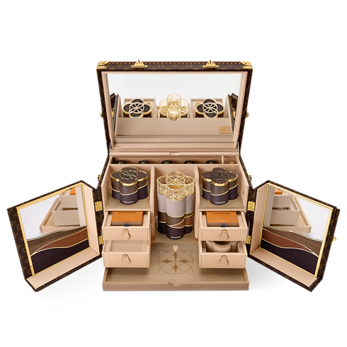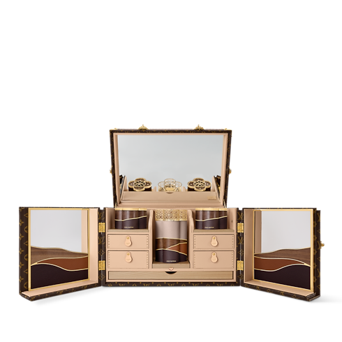 La excepcional caja Bakhoor, creada por Nada Debs para su colaboración con Louis Vuitton, se inspira en las líneas ondeantes de las dunas del desierto. Este modelo único se realza con la refinada maestría en marquetería de la artista libanesa. Incluye un juego completo para la ceremonia árabe: un quemador de madera de agar, una pinza de color dorado y elegantes recipientes para guardar las exquisitas virutas de madera.